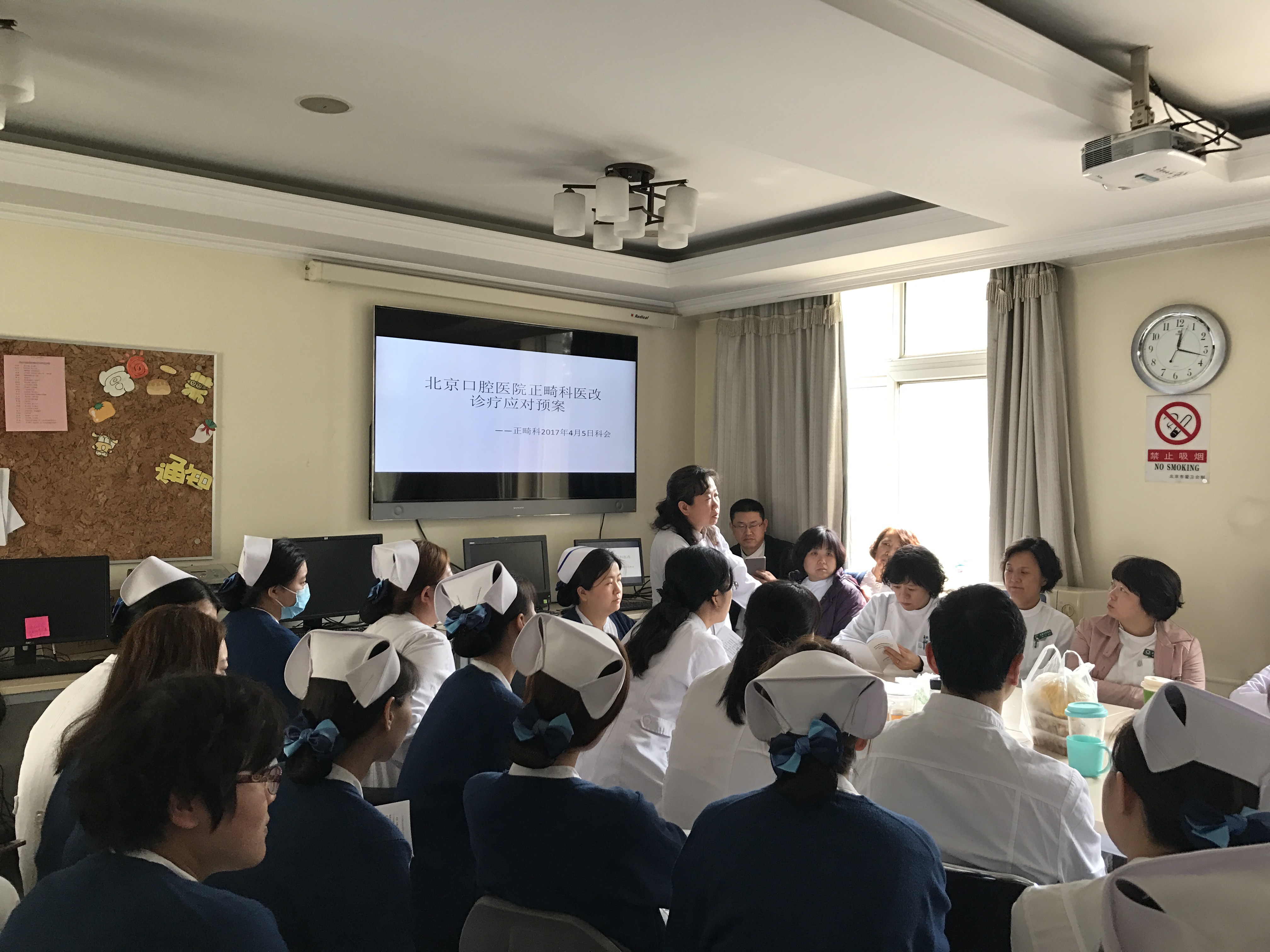 4月5—6日中午,正畸科分别在两址召开医改诊疗应对预案说明会,王红梅主任就医改期间可能出现的问题逐一进行了讲解说明,再次强调此次医改的重要性以及合理安排医改期间值班主任的各项工作,并现场提问医生护士对口袋书知识点的掌握情况,每个岗位逐一提问,确保做到全员知晓。