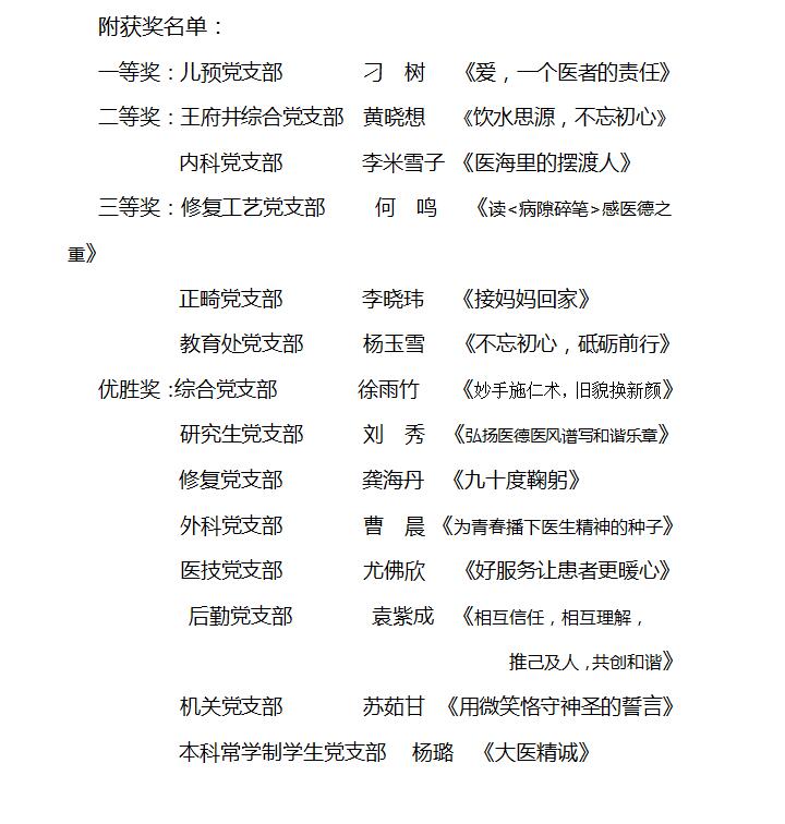 经过激烈角逐,最终儿预党支部刁树同志脱颖而出,获得比赛一等奖。她结合从业以来的见闻与经历,以“爱,一个医者的责任”为主题,在真实的故事中倡导医护人员严格要求自己,把全心全意为患者服务作为自己的神圣职责和道德标准,牢记天职,传递正能量,在下一个五年建设中承担起一名普通党员医务工作者的应尽的责任和使命。她的演讲言辞恳切,发人深省,催人奋进,给在场观众以深深启迪。此外,王府井综合党支部黄晓想、内科党支部李米雪子以精彩的表现获二等奖,修复工艺党支部何鸣、正畸党支部李晓玮、教育处党支部杨玉雪获三等奖。其他参赛选手获优胜奖。
