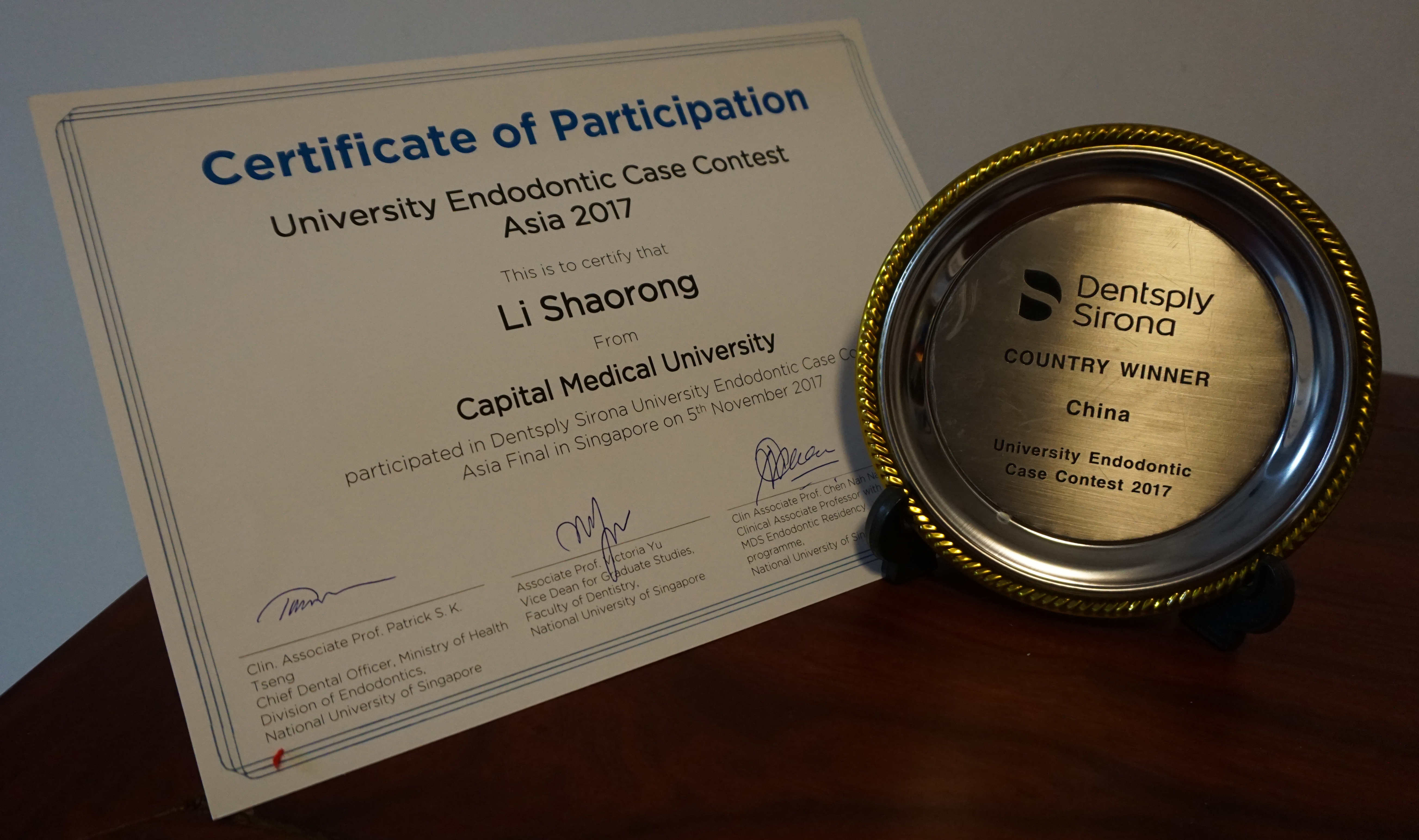 “亚洲学生根管治疗比赛”(University Endodontic Case Contest Asia 2017)是一年一度举办的口腔医学教育的重大赛事,旨在鼓励口腔医学生们夯实理论基础,熟练操作技巧,积极学习和掌握国际领先水平的治疗技术和方法。每年9月,全国包括四川大学、北京大学、武汉大学、中山大学在内的各大高校,均选拔优秀的口腔医学学生参加“亚洲学生根管治疗比赛”,赛程分为国内比赛及国际比赛两个阶段。国内赛程包括收集病例、高标准根管治疗操作、整理病例资料撰写全英文病例介绍及讨论等,由国内外专家盲审并评选出一位冠军参加亚洲区决赛。本次比赛,首都医科大学共选派了3名口腔医学研究生参赛,全国共约30余名学生参赛。经过紧张激烈的角逐,我院2015级口腔内科学硕士研究生李韶容同学在全国众多选手中脱颖而出,荣获中国区冠军,取得了参加亚洲区决赛的参赛资格。
