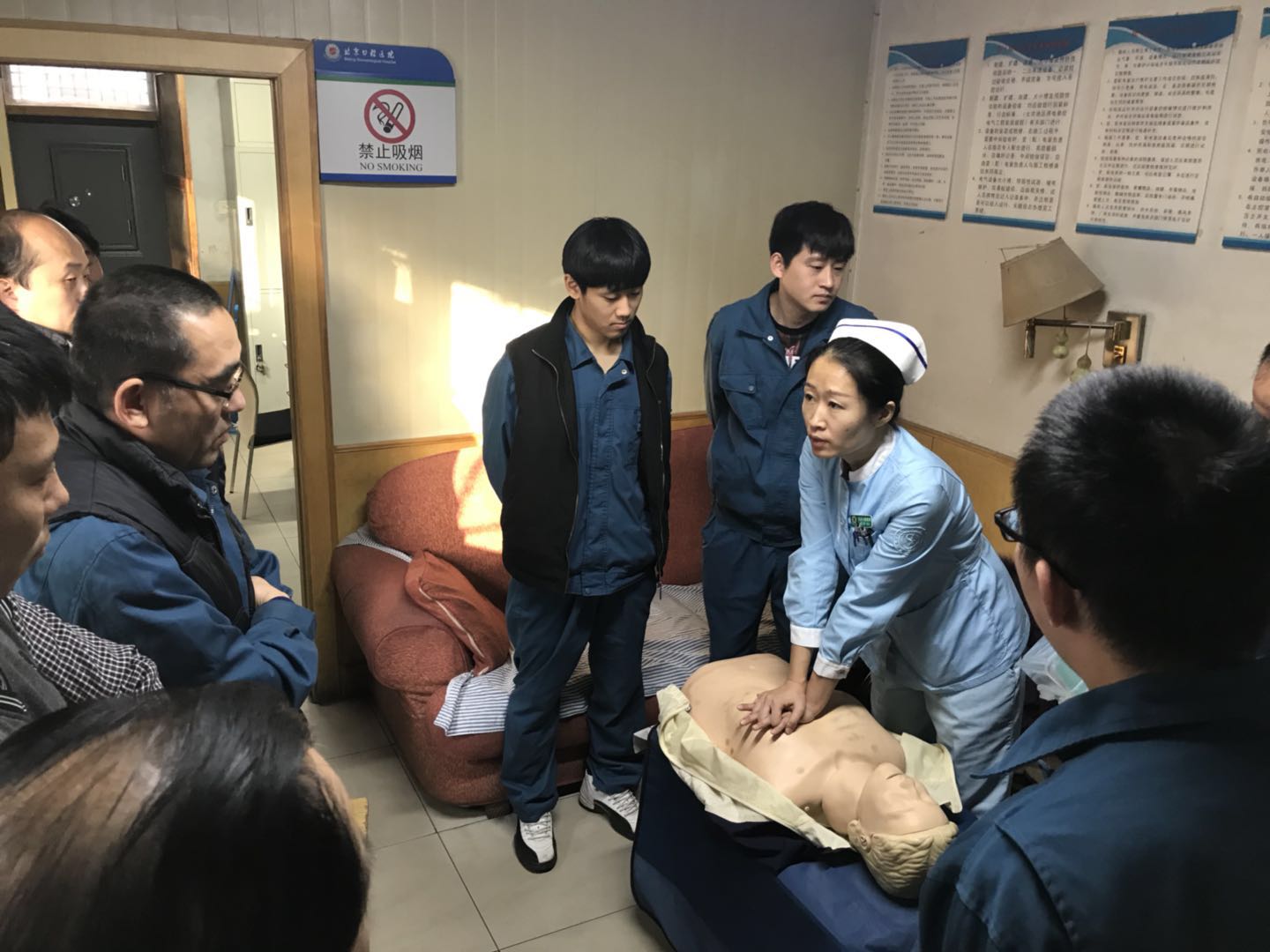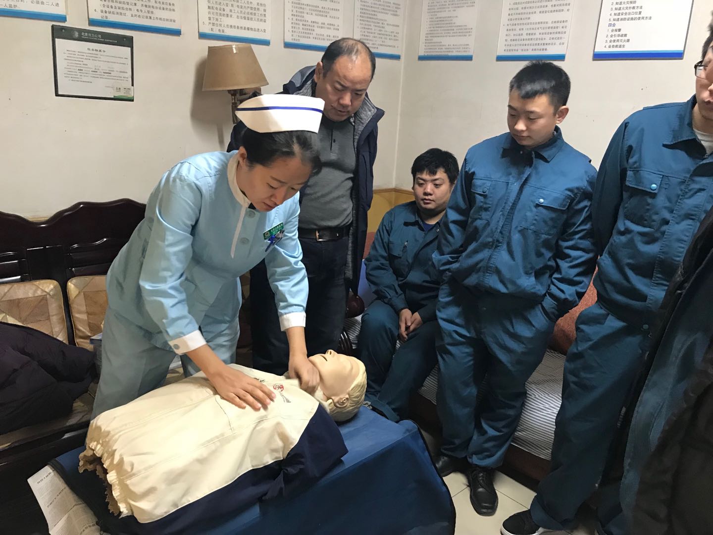 为贯彻“安全第一、预防为主、综合治理”的方针,提高事故应急救援能力,有效处置突发事故,建立和完善科学、有效、运转良好的应急救援体系,提高应对和预防意外伤害情况下的自救互助能力,11月28日上午,总务处邀请急诊综合诊疗中心护士长为电工班全体员工进行急救知识培训。