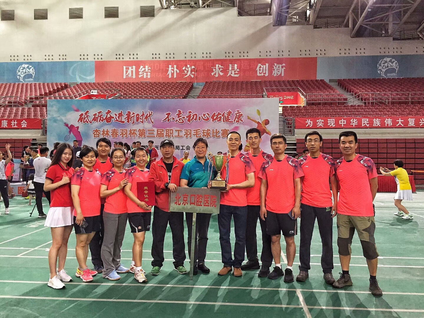 “砥砺奋进新时代,不忘初心佑健康"。2018年5月5日-6日,由北京市医管局组织的杏林春雨杯第三届职工羽毛球比赛在中国农业大学体育馆举行,来自市属医院和市医管局机关共23家单位的300余名运动员参赛。我院羽毛球队通过两天的顽强拼搏,一路过关斩将闯入八强,最终取得了团体比赛第六名。