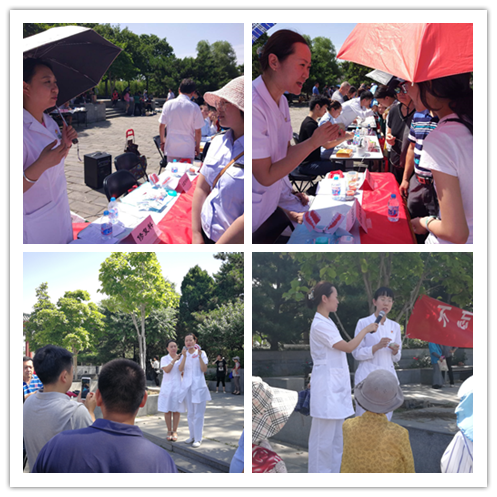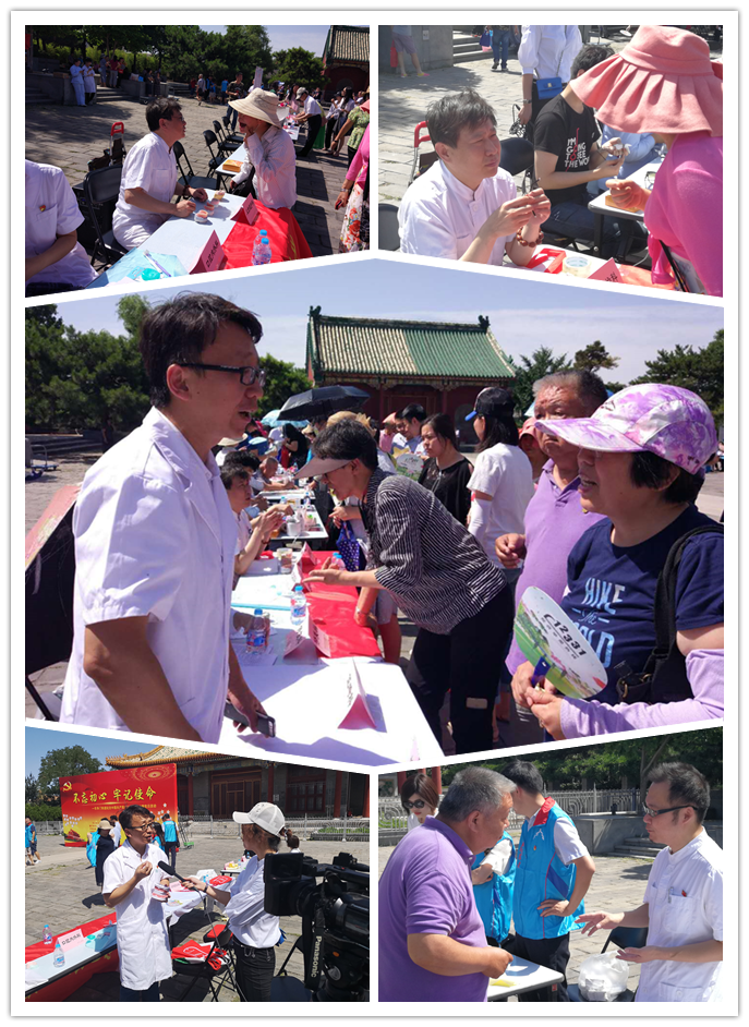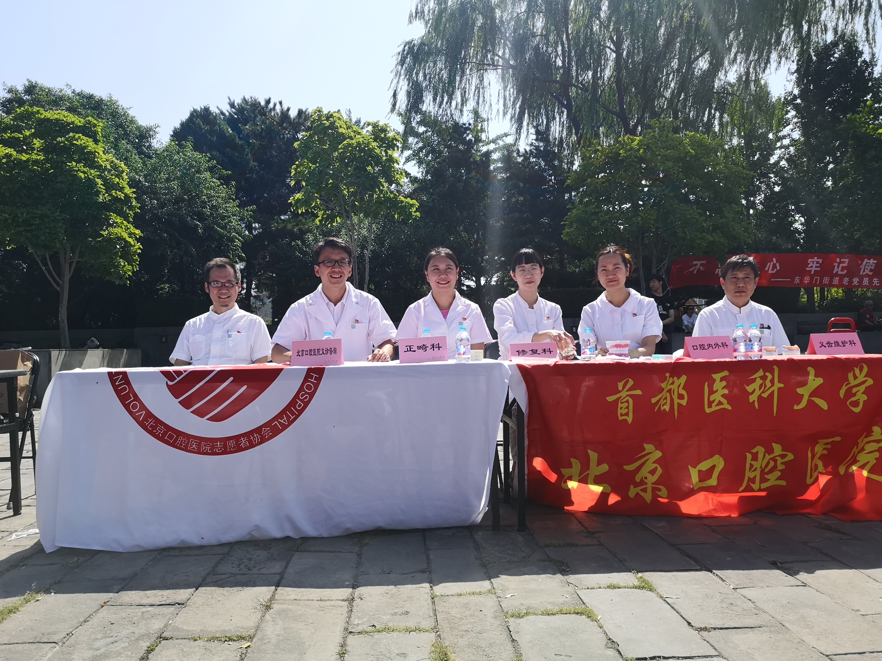 6月27日上午,烈日炎炎,在37度高温下,由3个支部6名同志组成的咨询讲解志愿者团队按时来到活动地点普度寺大庙前,大家分专业将宣教教具依次摆放在桌上,为群众答疑咨询,并进行口腔健康知识宣教。