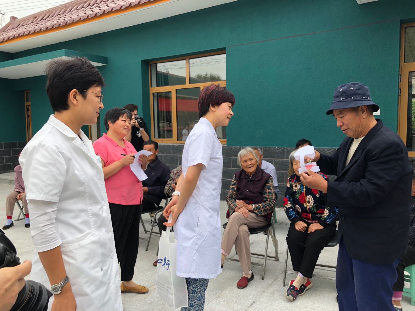 在义诊现场,由来自牙体牙髓科、牙周科和口腔黏膜科的九位专家组成的“义诊专家团”为东河村百姓逐一进行了全面细致的口腔检查,通过询问病史、用药史及全身情况为每位村民提供了个体化的口腔诊疗建议,并对大家最为关注的口腔健康问题进行了耐心的解答。面对络绎不绝的咨询群众,专家们始终用心倾听、暖心安慰、耐心解答,以医者仁心的情怀尽心为每一位参加义诊的村民提供帮助。同时,由年轻医师组成的宣传组成员在义诊活动中向大家分发口腔健康宣传资料、口腔医院就诊指导手册以及牙膏牙刷等口腔卫生保健用品,以进一步帮助大家提高口腔自我保健的意识和能力。
