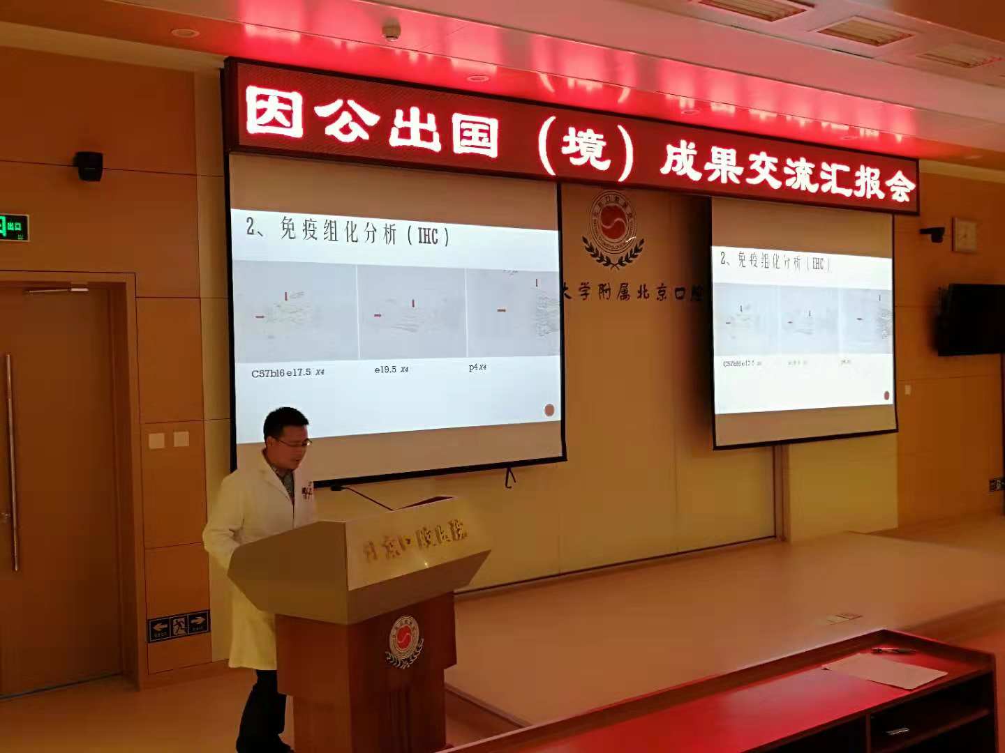 胥毅医师重点讲述了他在美国得州农工大学牙学院开展的“小鼠3号染色体开放阅读框架38基因的探索研究”情况以及下一步的研究计划,并与与会人员交流了访学的整体感受。