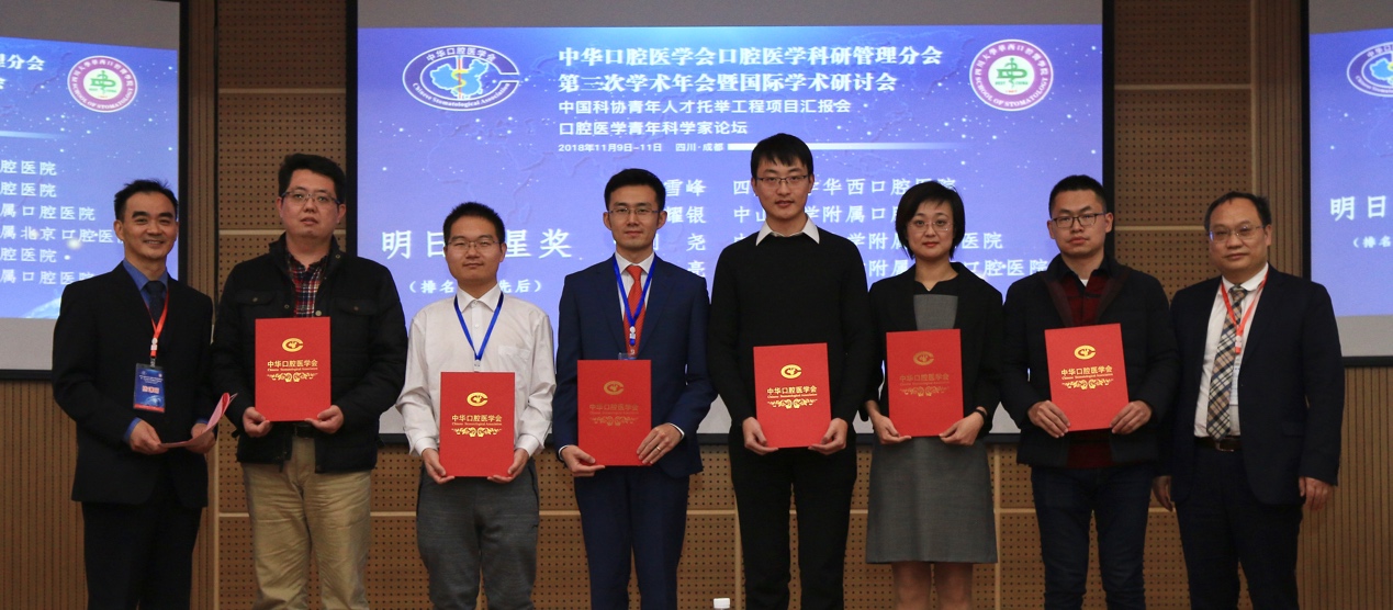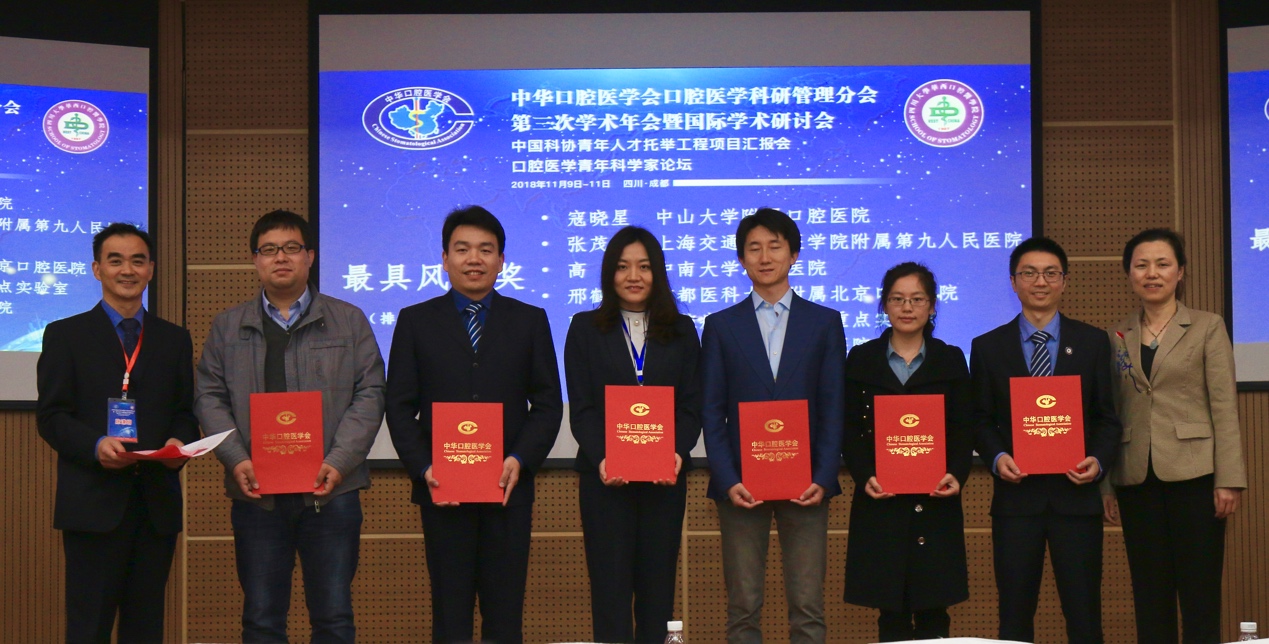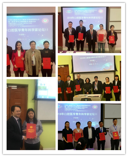 会议同期举行了中国科协青年人才托举工程项目汇报会、2018口腔医学青年科学家论坛。我院急诊综合诊疗中心靳路远博士作为青年人才托举项目负责人进行了结题汇报,与其他院校的优秀青年科研人才同台交流。2018口腔医学青年科学家论坛集中了各大口腔院校择优推荐的70余名青年人才,共分为三个分会场进行评选。共评选出“明日之星奖”、“最具潜力奖”、“最具风采奖”各6名、优秀奖9名、“最佳组织奖”6名。我院修复科邢鹤琳博士总结最新科研成果做了关于“siCTSK@AuNP功能化钛表面通过重塑巨噬细胞功能促进骨结合”的报告,荣获“最具风采奖”;口腔颌面外科门诊胡亮博士做的关于“Shh基因转导通过上调RyR保护副交感神经研究”的报告,荣获“明日之星奖”。两位获奖者均为32周岁以下,将有机会获得2019年中华口腔医学会人才项目申报的推荐机会。同时,我院也因组织参加本次学术会议表现出色,荣获“最佳组织奖”。