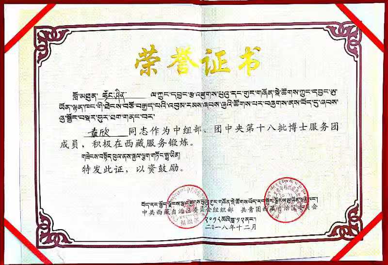 黄欣同志作为第18批博士服务团成员在西藏自治区卫生与计划生育委员会挂职党组成员、副主任,积极投身基层卫生和健康扶贫工作,一年时间,他走遍了全区7个地市42个县的乡卫生院和村医室,深入基层调研,结合当地实际开展工作,勇于担当,甘于奉献,踏实认真的完成各项工作任务,体现了新时代领导干部的责任担当,为促进脱贫攻坚和民族团结做出了贡献,得到了自治区组织部及卫生计生委领导的高度评价,荣获西藏自治区组织部及团区委颁发的荣誉证书及奖章。