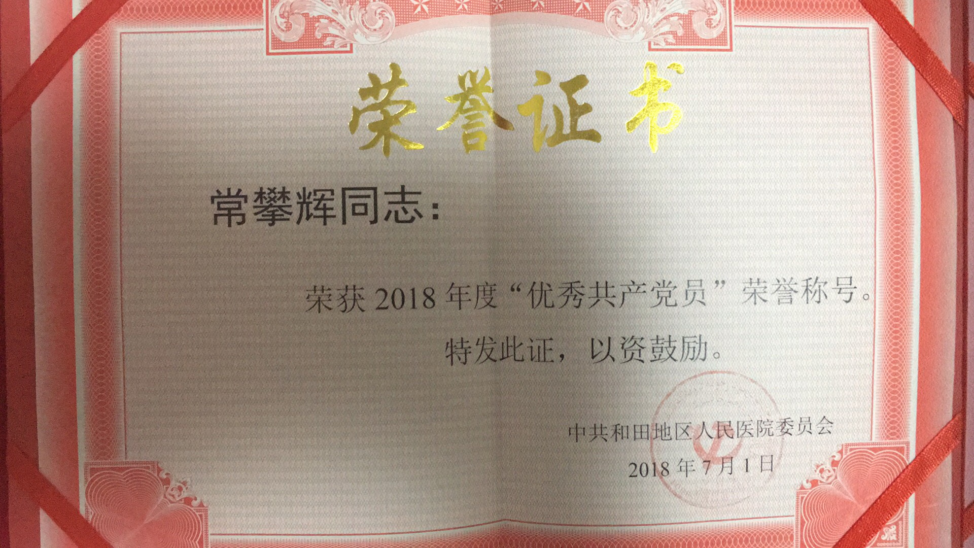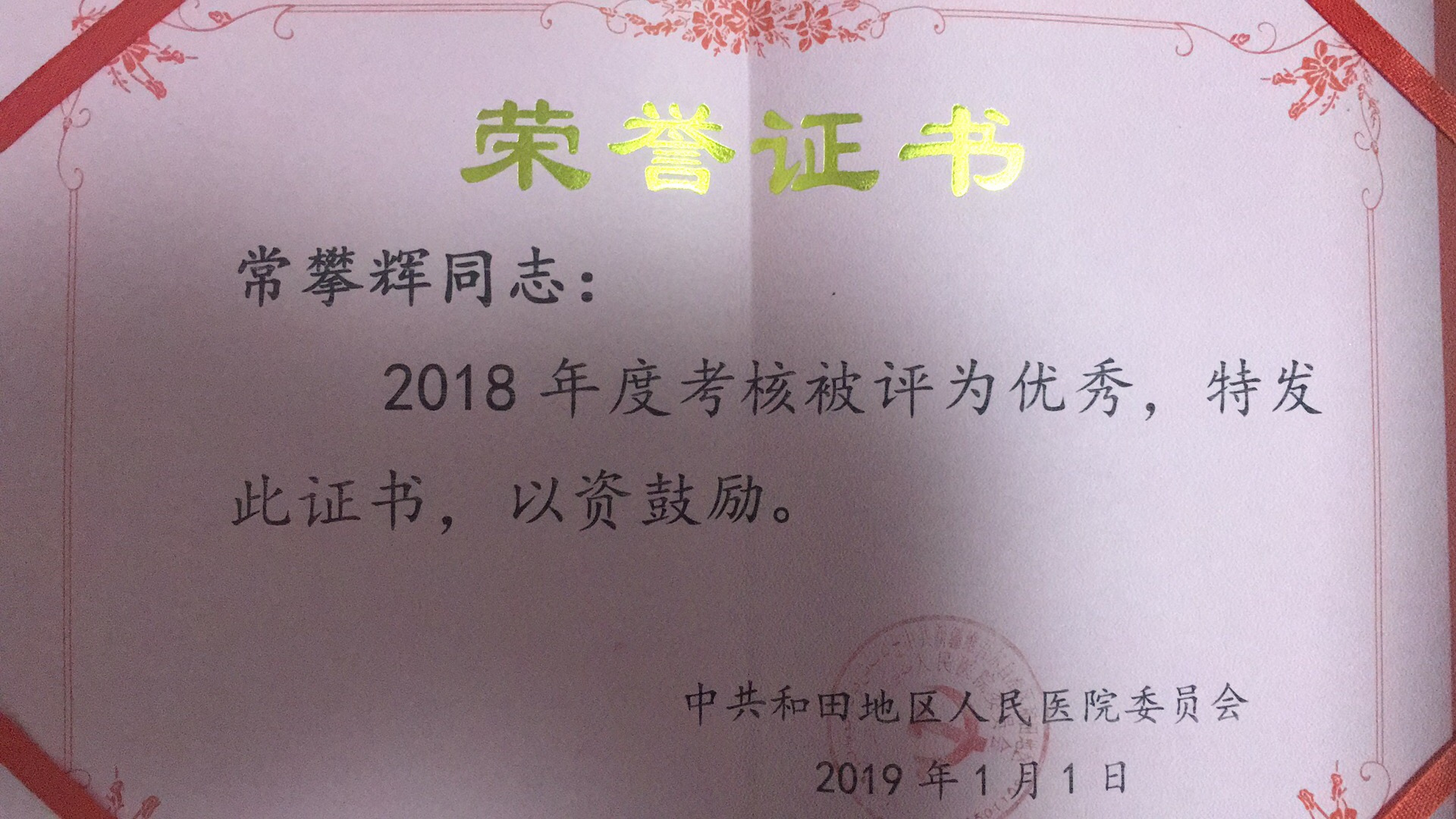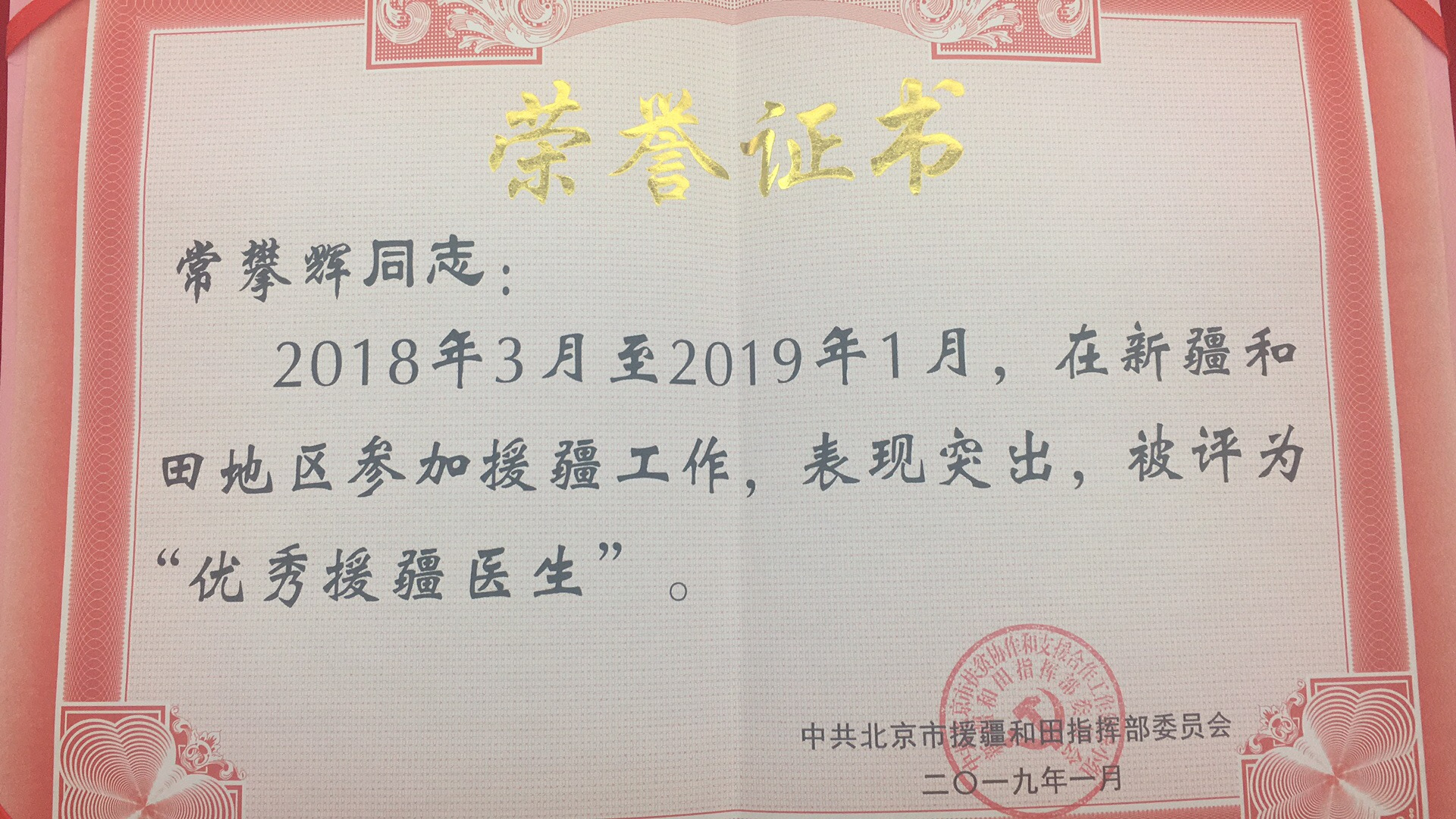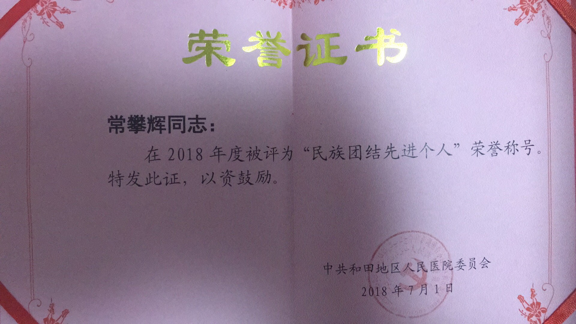 通过一年努力常攀辉同志圆满完成了援疆任务,与当地同行、患者结下了深厚友谊,其优异表现得到了各级领导的肯定与赞扬。她荣获了北京援疆和田指挥部“优秀援疆医生”、和田地区人民医院2018年度“优秀共产党员”、“民族团结先进个人”等荣誉称号,在年度考核中被评为优秀。