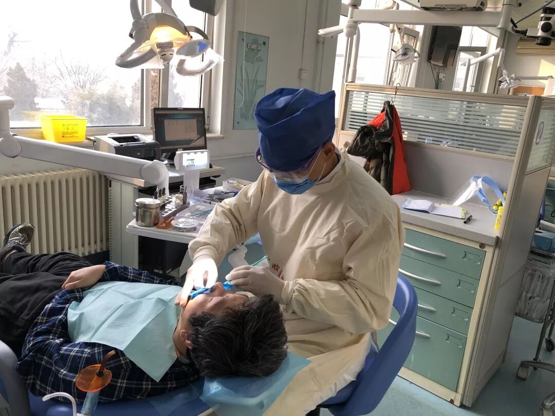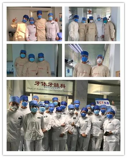 医生孙驰和护士何静主动请缨,承担了第一例全面防护下的开髓治疗;并与副主任张琛、护士长刘玉英一起,在独立诊室,为多位患者进行了必要治疗。