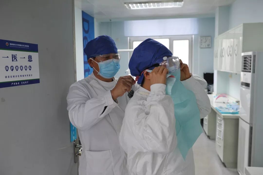 开诊第一天,大家早早来到医院,换好工作服沿着工作人员通道来到急诊综合楼。作为特殊时期口腔门诊综合诊区负责人,牙体牙髓科主任侯本祥已经守在门口迎接大家了。牙体牙髓科护士长刘玉英、外科门诊护士长宋燕敏负责大家签到,领取隔离衣、帽子、口罩等防护用品,指导监督大家按要求进行穿戴,引导不同专业的医护人员进入相应的诊室,做好开诊准备。党委书记谷水和副院长刘静明,逐一认真地巡视了各个诊室,检查每位医护人员的防护措施是否合格到位,亲切叮嘱大家,科学防护,确保诊疗安全。