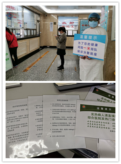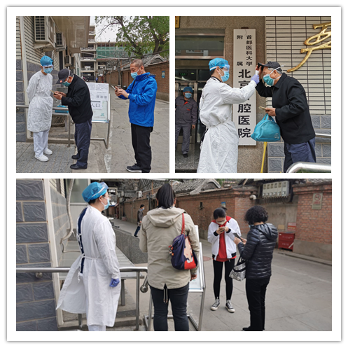 为配合就诊患者及家属筛查工作,王府井部预检分诊和安保人员紧密配合,对进院人员进行筛查、询问、测温等。党员先锋岗杜岩医生按要求防护,提前到岗,手持提示牌做好引导准备。王府井部综合管理办公室、各临床科室、医技科室、物业、安保等部门人员也都早早准备,各司其职,等待迎接复诊的首批患者。在这个特殊时期里,大家更加紧密协作,并肩作战。