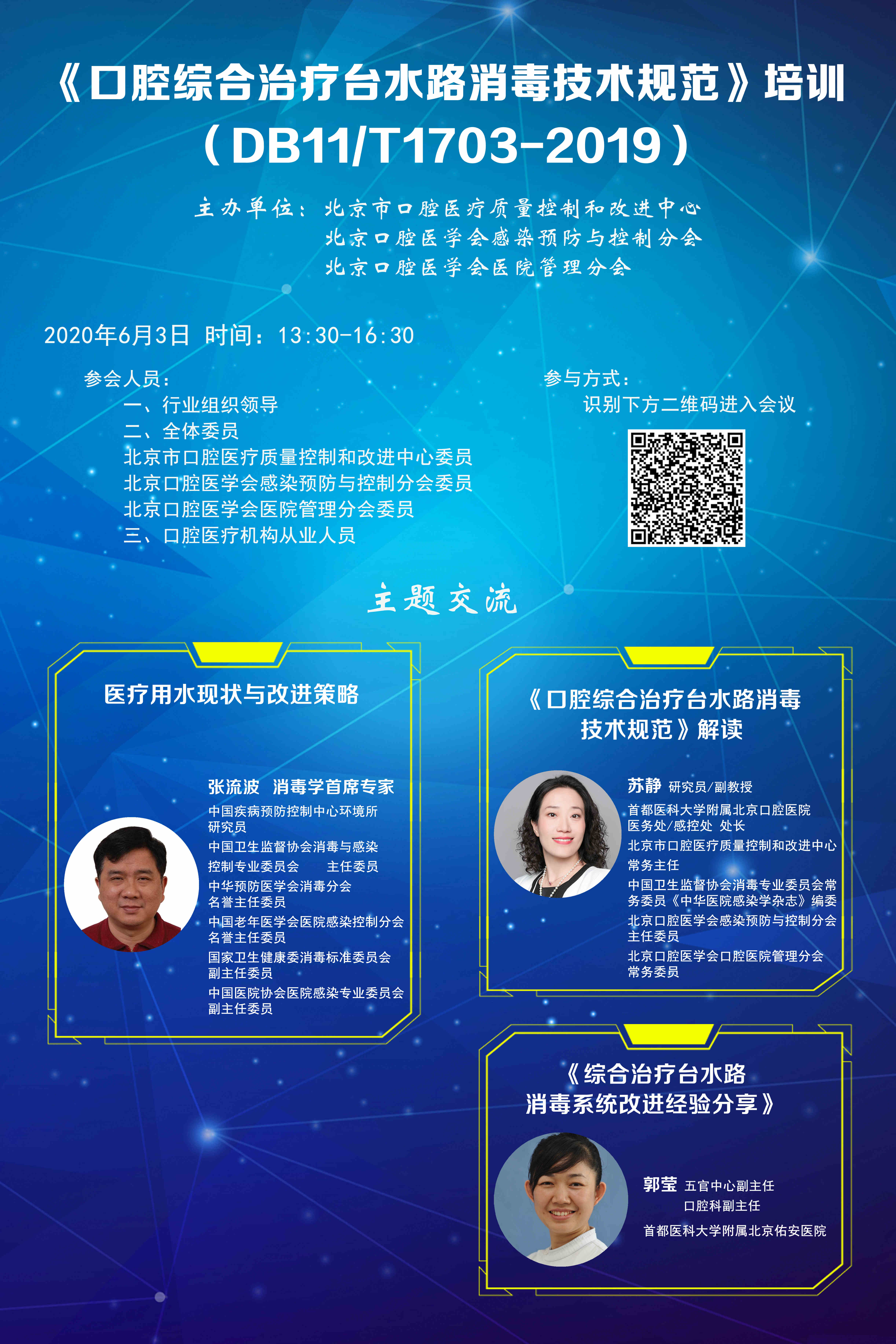 北京口腔医院作为北京市口腔医疗质量控制和改进中心的主任委员单位,在全国率先开展了《口腔综合治疗台水路消毒技术规范》地方标准的编制工作。口腔界第一个“水路消毒技术规范” (DB11/T 1703-2019)地方标准于2020年4月1日正式实施。2020年6月3日,北京市口腔医疗质量控制和改进中心联合北京口腔医学会感染预防与控制分会、北京口腔医学会医院管理分会举办了线上贯标培训,全国各地的院感管理者、口腔医生和护理人员,共8000余人参加。