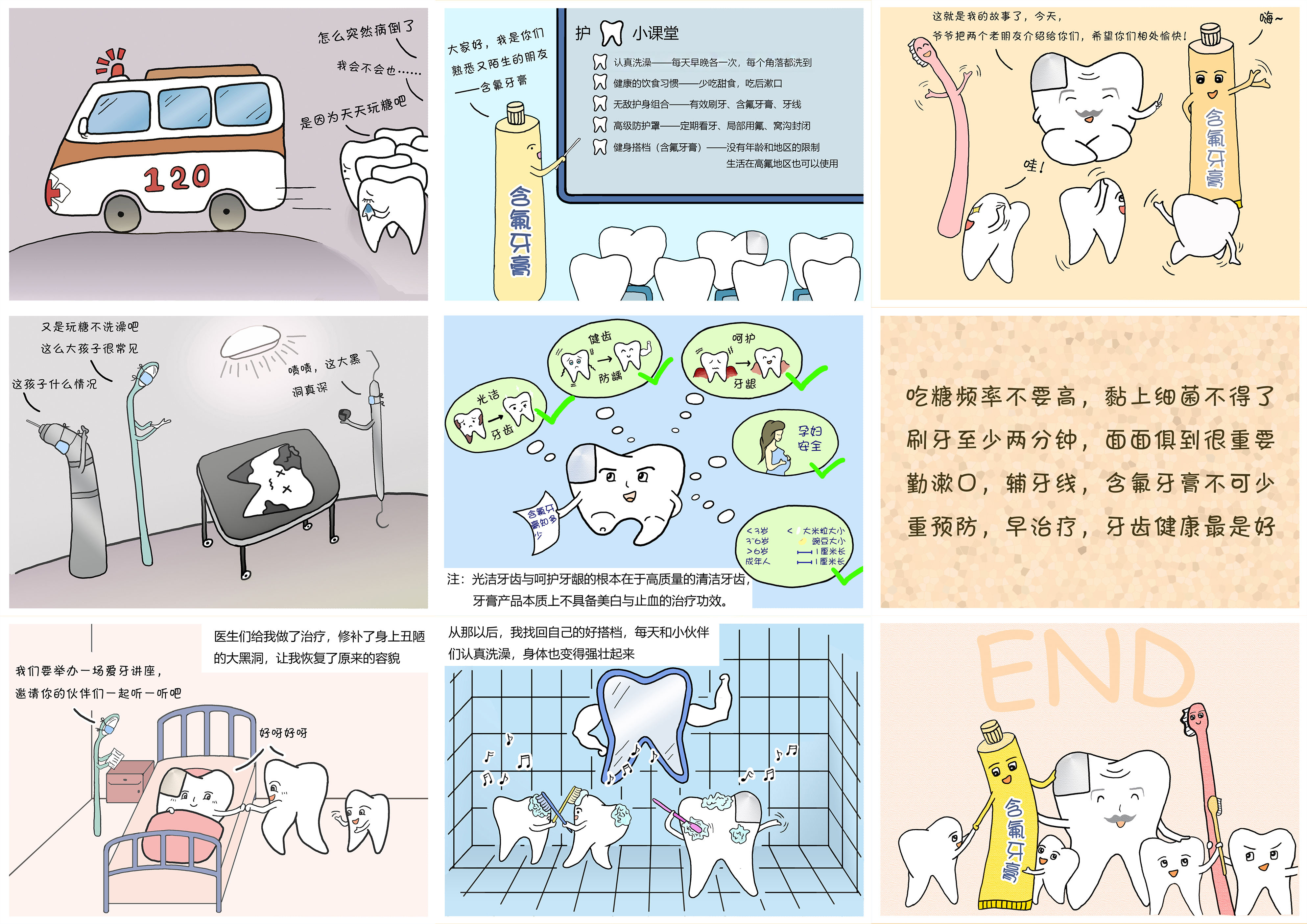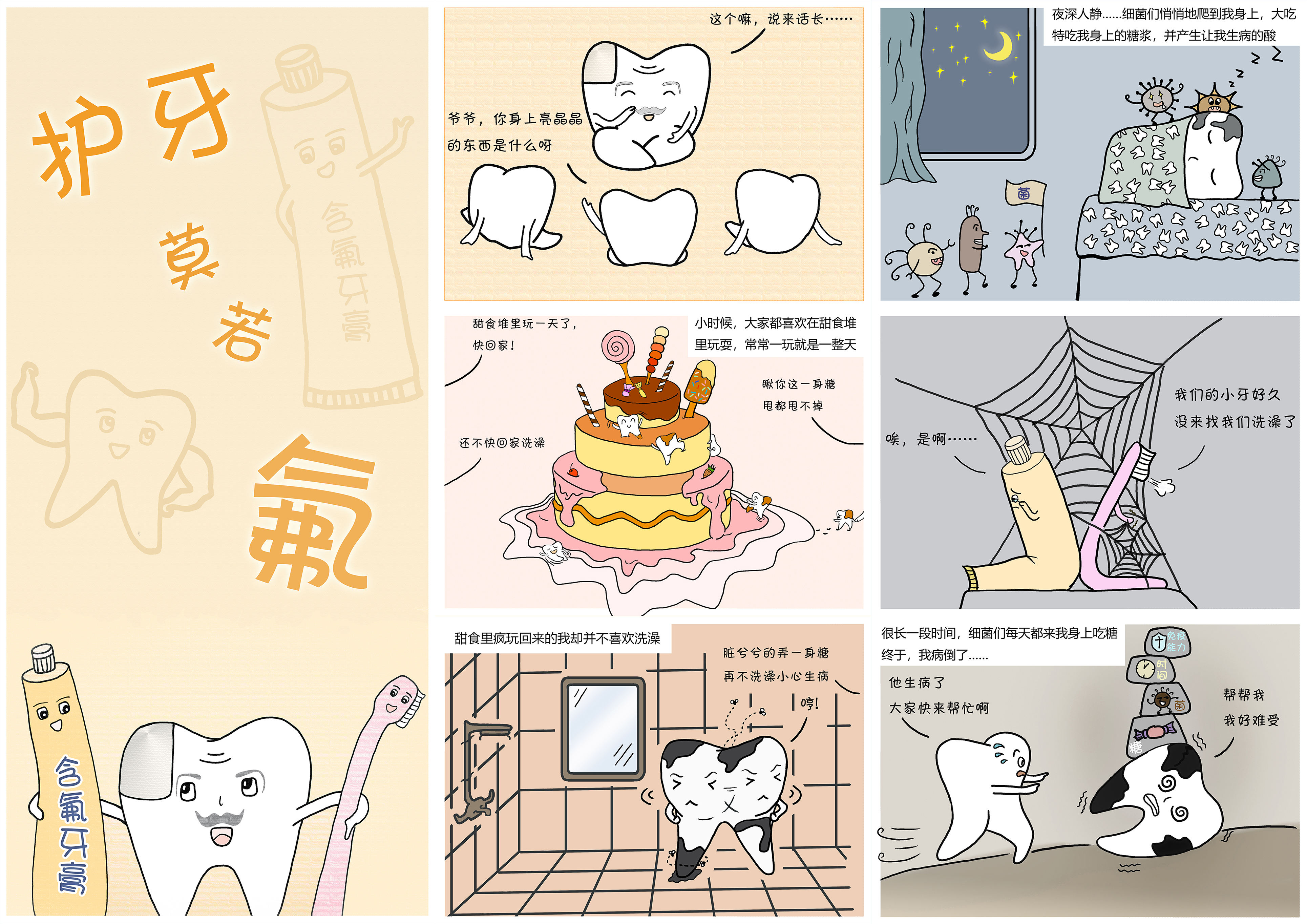 此次大赛共收到全国口腔医学院校参赛作品560份,参赛院校包括北京大学医学部、四川大学、武汉大学、中山大学等诸多国内著名大学。大赛设卓越作品8份、杰出作品21份、新锐作品36份、潜力作品85份。其中,我院2016级长学制班级杨婧同学小组创作的作品以手绘折页的形式,以打消大众对含氟牙膏的顾虑作为创作目标,用可爱的卡通形象,生动地介绍了含氟牙膏的作用。作品立意鲜明、内容科学、旁白通俗、表现形式生动、让人耳目一新,最终脱颖而出,荣获卓越作品奖。