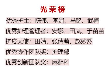 表彰是对我院护理人员的激励,通过弘扬护理先进典型和事迹,树立先进榜样,营造爱岗敬业、争先创优、积极进取的工作氛围。全院护理人员会以受表彰人员为榜样,热爱护理岗位,履行增进健康、保护生命、减轻人类病痛的专业职责,做适应新时代发展的专业护理人员。