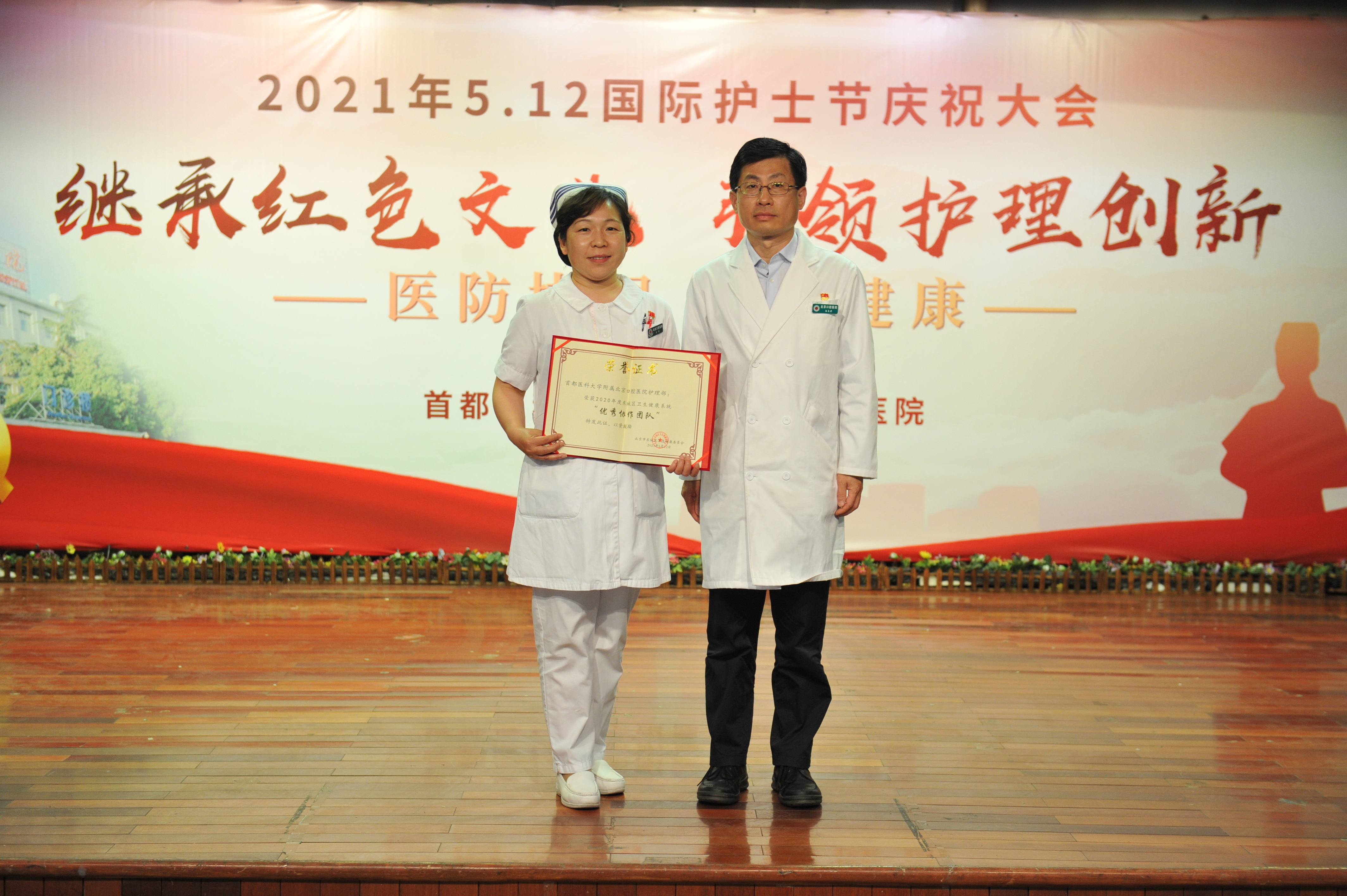 活动中,秦志轶副主任和刘琼科长为护理人员献上节日鲜花和贺卡,并与院领导一起,为在北京市东城区卫生系统2021年纪念“5.12”国际护士节评优活动中获奖的个人和团队颁奖。