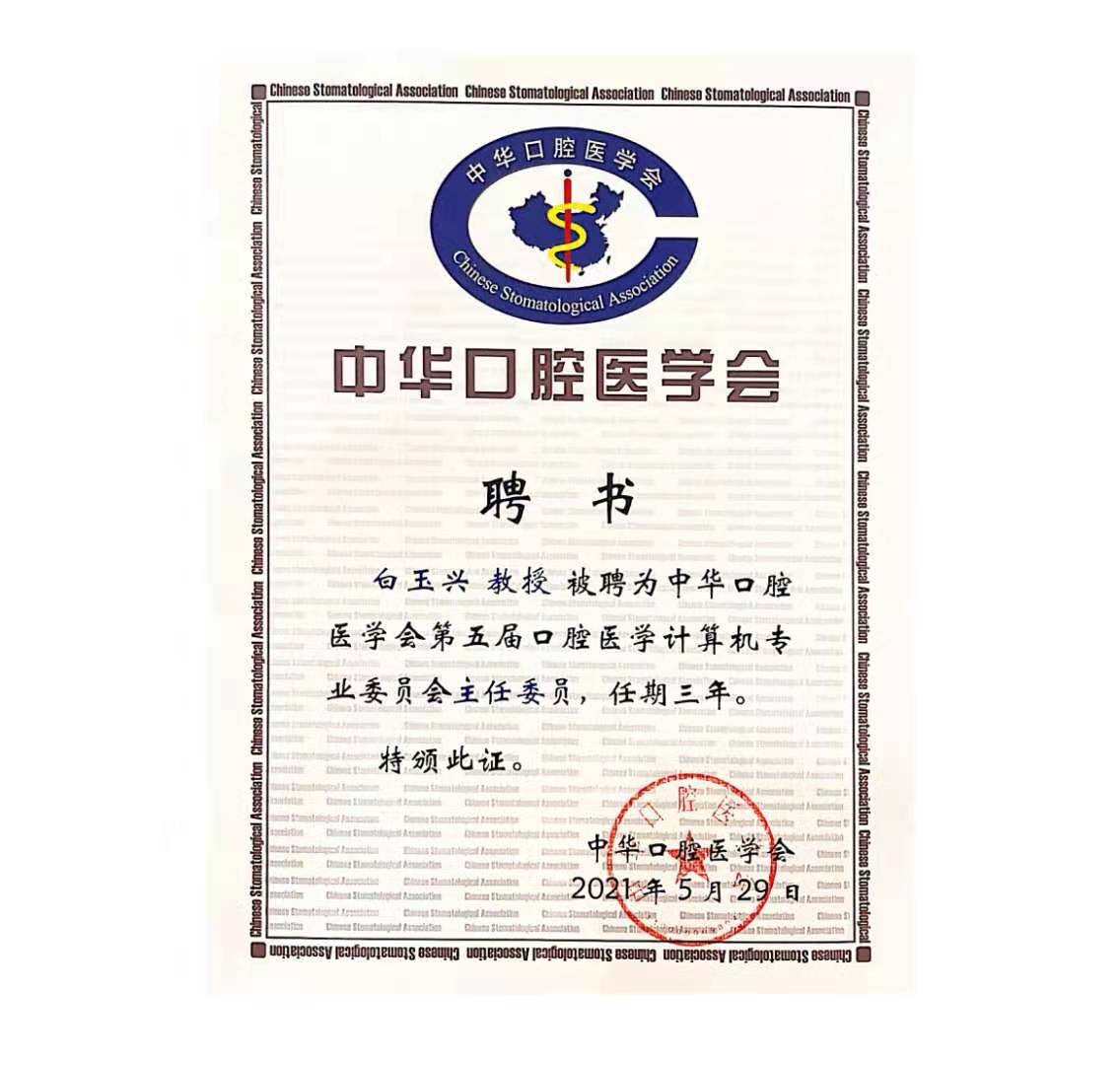 第十八次全国数字化口腔医学学术大会暨第五届中华口腔医学会口腔医学计算机专业委员会换届会于2021年5月29日在北京召开。我院白玉兴教授当选本届专委会主任委员。