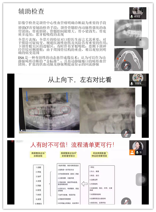 会议于20点准时开始,首先进行相关知识点学习。头颈肿瘤科主任韩正学对颌骨常见病变,特别是本次病例涉及的颌骨动静脉畸形进行了讲述,并结合几例经典病例分析了这类疾病的临床特点;颌面外科门诊主任单兆臣结合文献回顾和临床经验,介绍了这类疾病的典型特征、诊断和处置的进展;放射科副主任祁森荣结合案例从影像学角度介绍了此类疾病的典型影像学特征、诊断与鉴别诊断方法,三位专家的讲授,使大家对这类疾病有了初步认识。