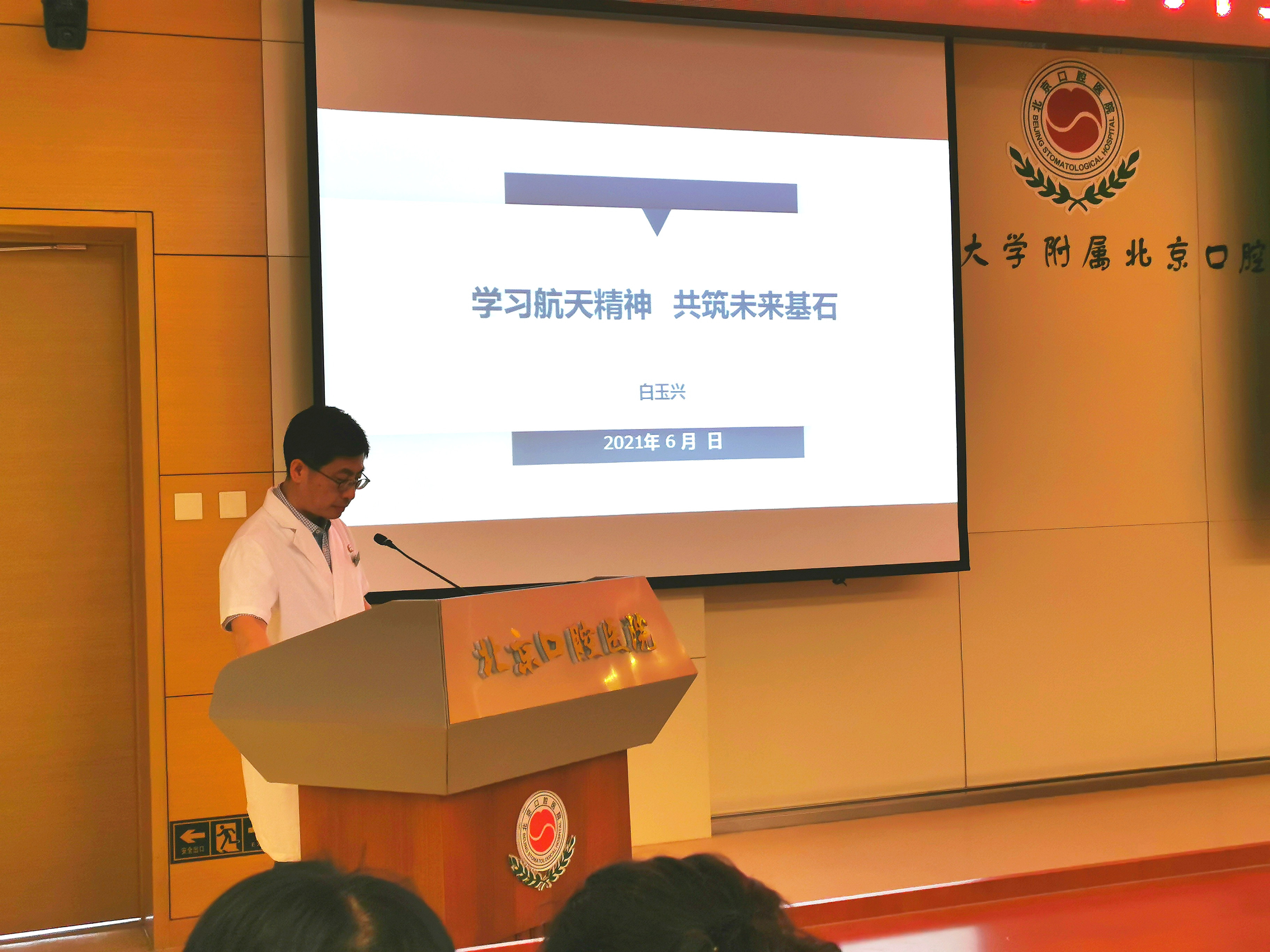 2021年6月28日,在庆祝建党100周年的伟大时刻,北京口腔医院党委副书记、院长白玉兴在阶梯教室为内科、科研及医学会党支部讲述了一堂生动党课,重温百年奋斗征程,深入贯彻领会习近平中国特色社会主义新思想,以“学习航天精神 共筑未来基石”为主题,带领大家深刻回顾总结了中国航天精神,与会党团员及积极分子都深受鼓舞。