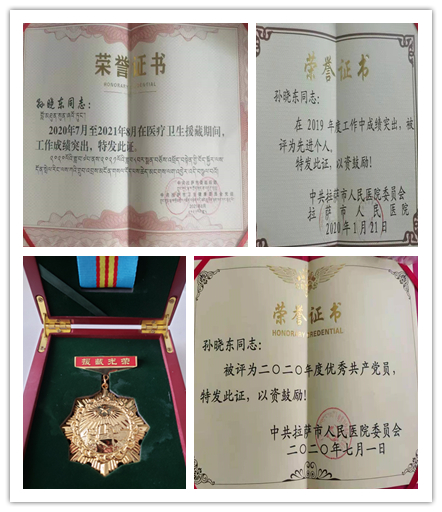 孙晓东同志勇于担当,甘于奉献,舍小家、顾大家的精神和不畏艰苦、深情融入、务实做事的作风,得到了当地干部的认可和高度评价,在雪域高原上绽放出了别样的风采。挂职期间荣获拉萨市人民医院2019年度先进个人、2020年度优秀共产党员、北京市卫生健康委员会2020年度优秀共产党员等多项荣誉。