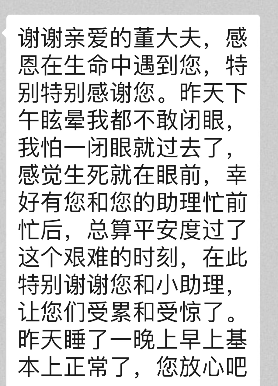杨女士说,这是第一次发病,感觉像在鬼门关走了一趟,幸好在口腔医院遇到了董雯副主任医师,在最无助的时刻得到了快速及时的帮助。患者满怀感激之情,用手机发来一条长长的信息,对董雯副主任医师和所有帮助过她的医护人员表示感谢。