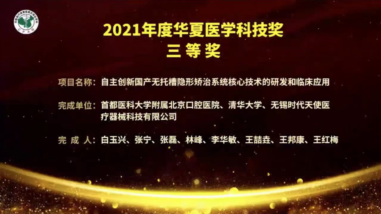 2021年12月7日,2021年度华夏医学科技奖颁奖大会在线上召开。我院白玉兴教授课题组申报的《自主创新国产无托槽隐形矫治系统核心技术的研发和临床应用》项目荣获华夏医学科技奖三等奖,白玉兴教授作为项目第一完成人,代表课题组参加线上颁奖大会。
