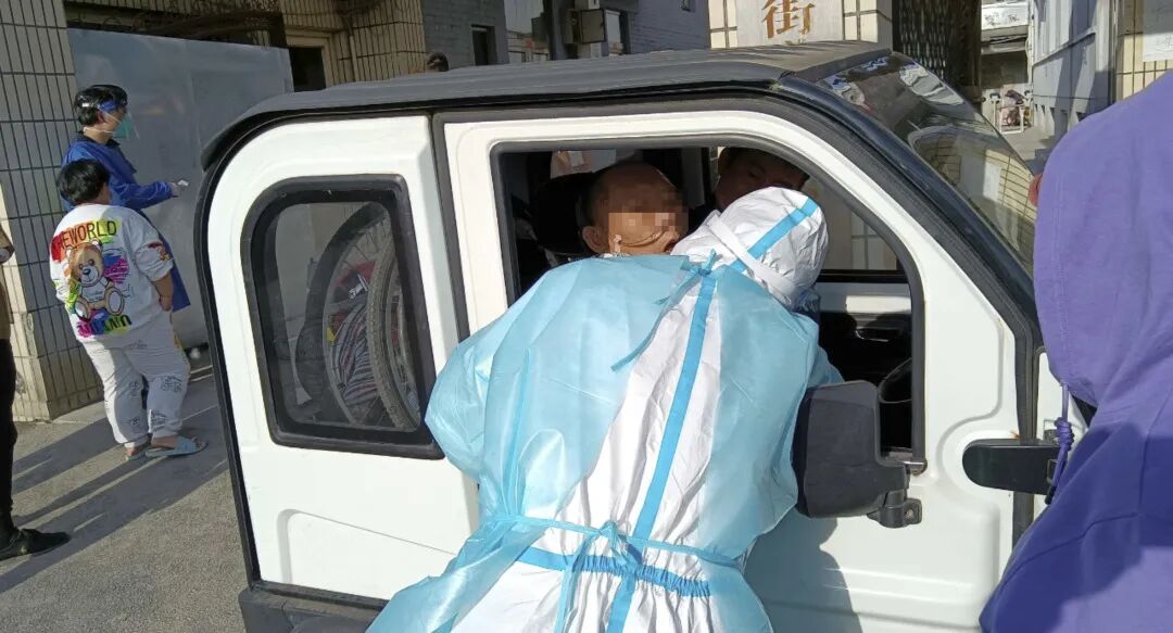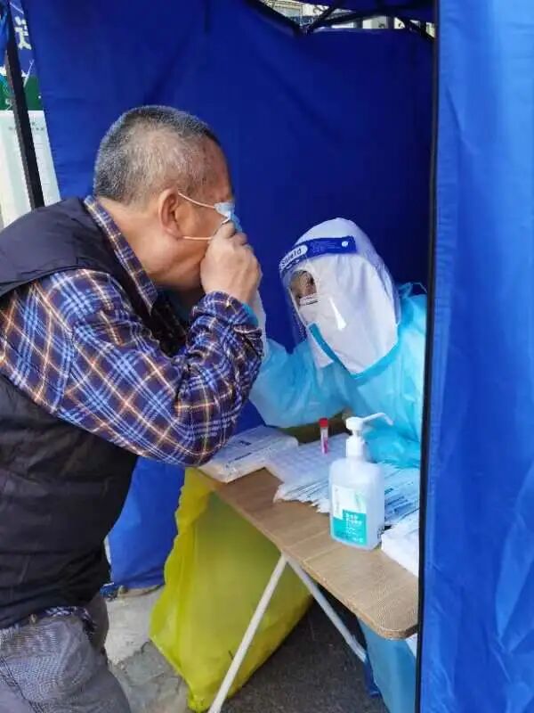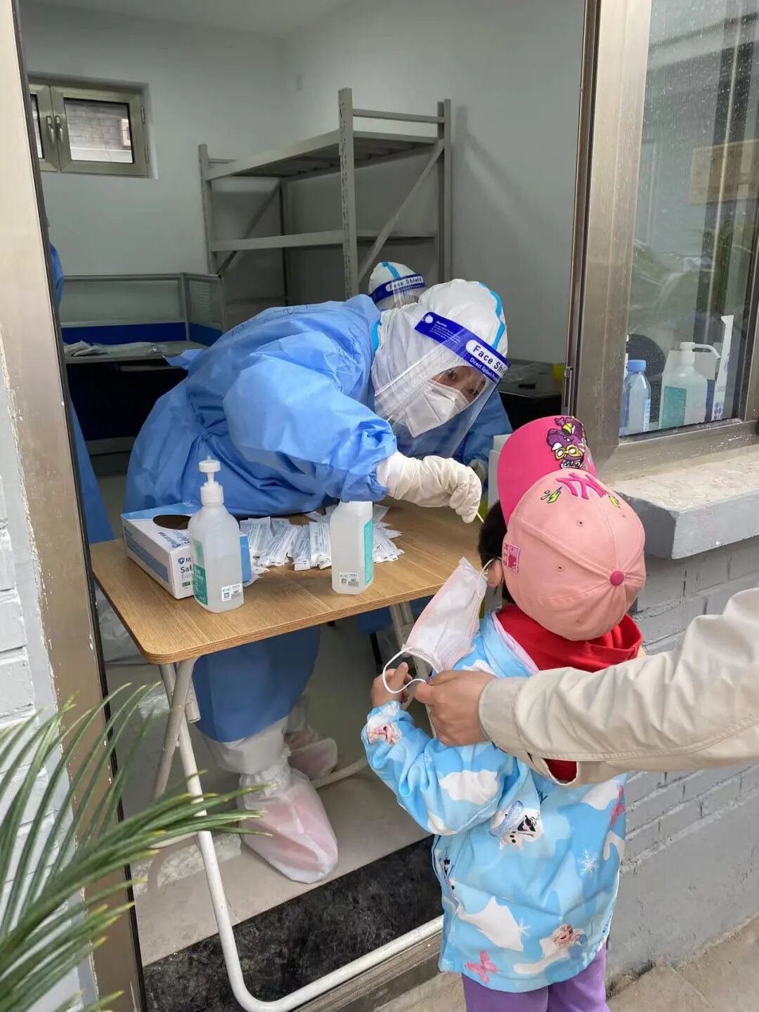 天坛街道办采样点,一名鼻腔插管、行动不便的老人来进行核酸检测。我院派出的采样小队成员,走出方寸,走近一步为老人采样,体现医者温度。采样点有很多小朋友,采样队员刘欣宇看出了小朋友的紧张,不停地和孩子聊天,动作轻柔,消除孩子的不安。