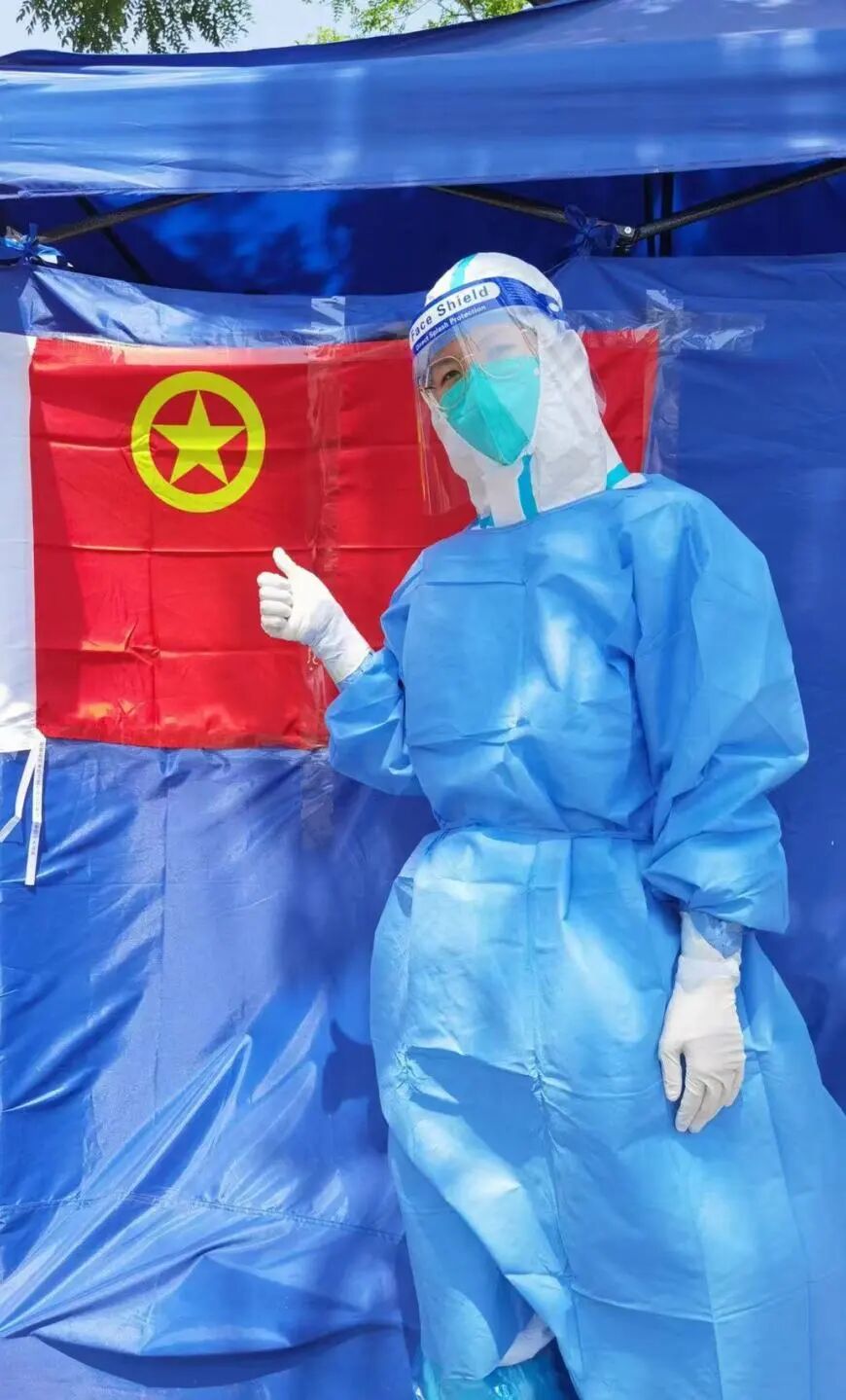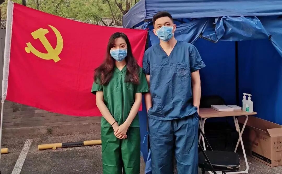 正畸科的马雁崧和种植中心的左晓云是一对刚刚团聚的年轻夫妻,他们参加了同一天核酸检测采样支援,结束一天的采样任务后,他们在党旗下照了一张最有意义的五四青年节合影,年轻的面庞熠熠生辉,这是青春最好的注脚。