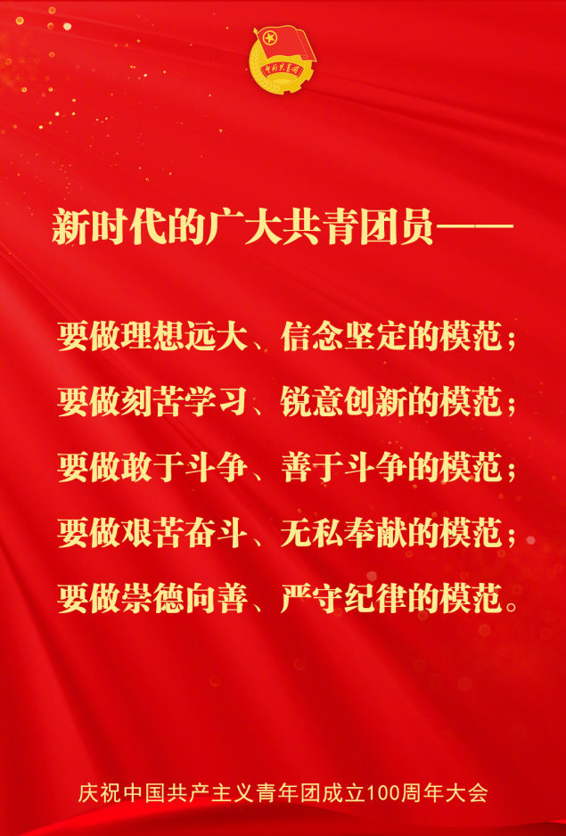 中国共青团成立100周年是历史性的一刻,我们是时代的见证者,也是时代的参与者。作为新时代的中国青年,我们要坚定不移跟党走、听党话,要时刻牢记时代赋予我们的使命,努力学习、不懈奋斗,为祖国建设贡献青春力量,为实现伟大的“中国梦”而奋斗努力。青春正好,向上吧,中国青年!