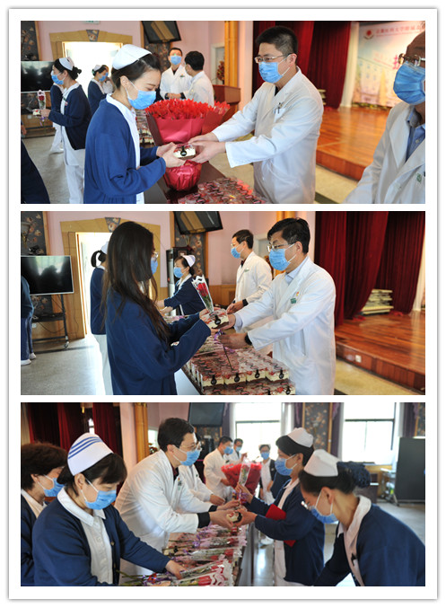12日上午院领导分别在天坛部、王府井部、西红门部三个院区为全院护理人员发放蛋糕和鲜花,在节日里为大家送上一份甜蜜的祝福。