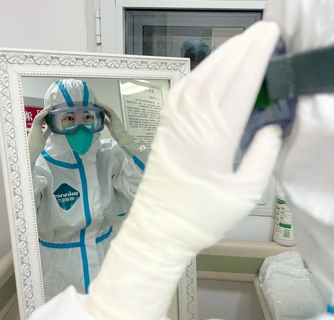 穿脱防护服丝毫不能马虎,在准备进入病房前,也会有“院感专盯”的老师检查,符合院感防控标准之后才能进入。
