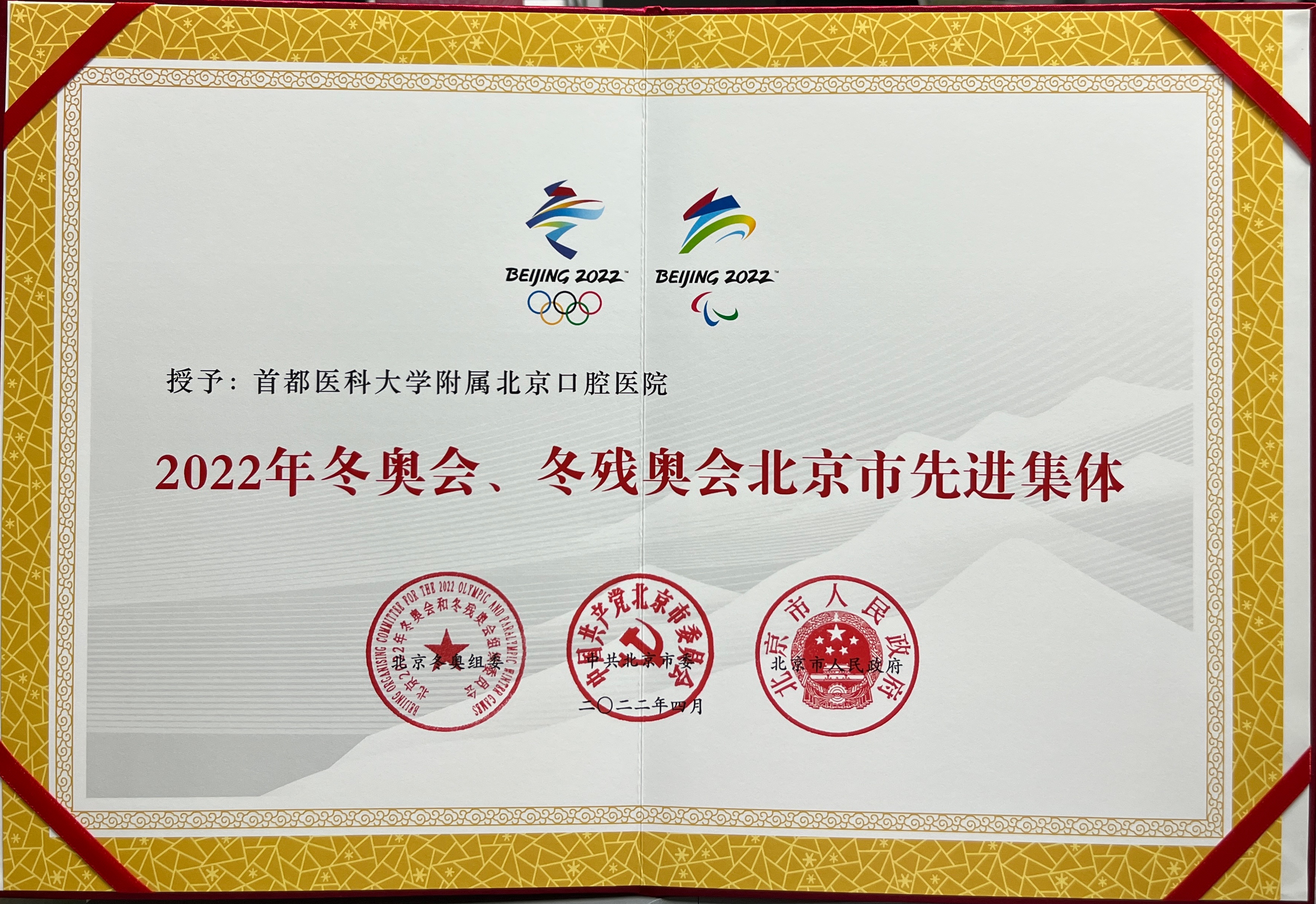 北京口腔医院被授予 “2022年冬奥会、冬残奥会北京市先进集体”称号