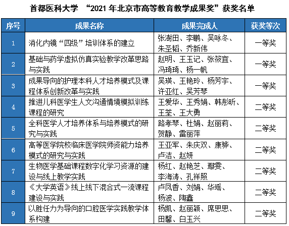 北京市教育教学成果奖由北京市教委、市人力资源社会保障局、市财政局联合开展,共同组织评审,每四年评审一次,对于全面推进教育教学改革,提升人才培养质量具有重要的推动作用。今年首都医科大学共有9项成果获得一、二等奖,其中4项为临床医学院获得,我院的教学成果是其中之一。