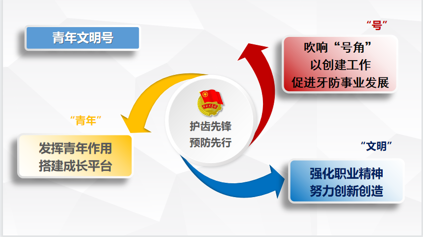口腔预防科现有成员30人,35岁及以下16人,占53%,是一支组织过硬、团结向上、高效有力的青年团队。除常规临床诊疗任务外,科室还协助北京市卫生健康委统筹管理全市口腔健康工作,承担口腔公共卫生项目的组织、实施和管理。开展 “青年文明号” 创建工作以来,团队成员秉持“护齿先锋,预防先行”服务理念,围绕创建要求,牢牢把握“青年”、“文明”、“号”三个维度——发挥“青年”作用、为“青年”搭建平台,在新形势下践行职业精神;吹响“号角”,以创建工作促进北京市牙防事业发展。