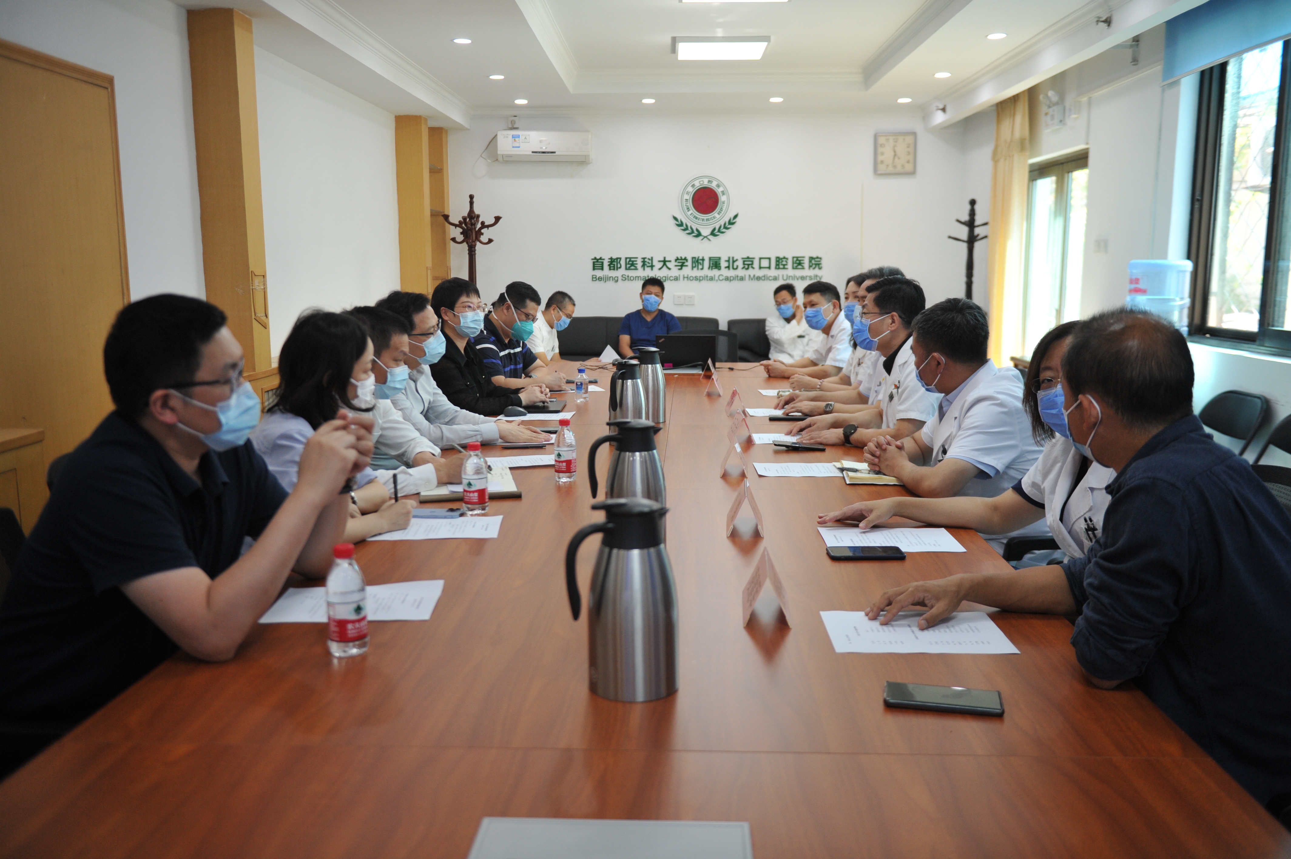 随后大家来到我院天坛部院区,医院领导班子成员及相关处室负责人与复旦大学口腔医学院的同仁进行了交流。大家就工程进度、三级流程、物流、交通、投资等工程建设细节,以及智慧医院建设、电子病历评级、互联互通、网络构架等信息化建设进行了深入交流;对疫情防控开展的各项院感措施以及新院建设过程中口腔综合治疗台水路、诊室气溶胶的消毒措施等内容进行了交流探讨。