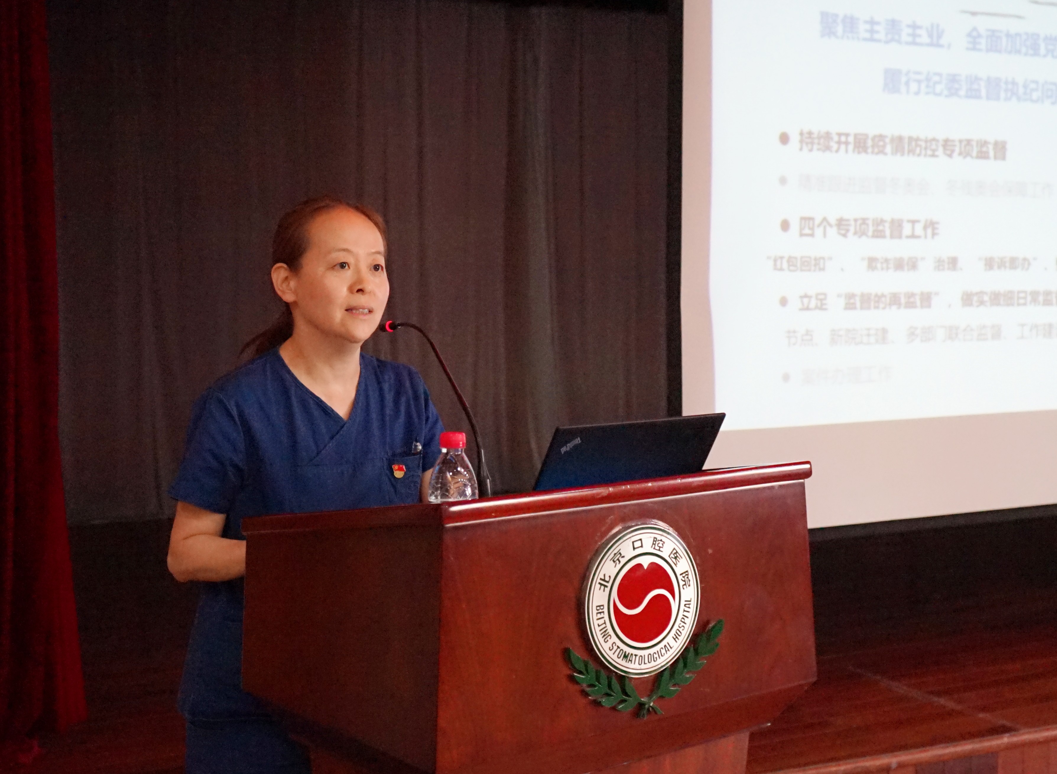 纪检办副主任石帅汇报2022年纪委工作,重点聚焦疫情防控、“红包回扣”、“接诉即办”、“欺诈骗保”、廉洁教育、迁建监督、重要节点和行业作风监督等工作。