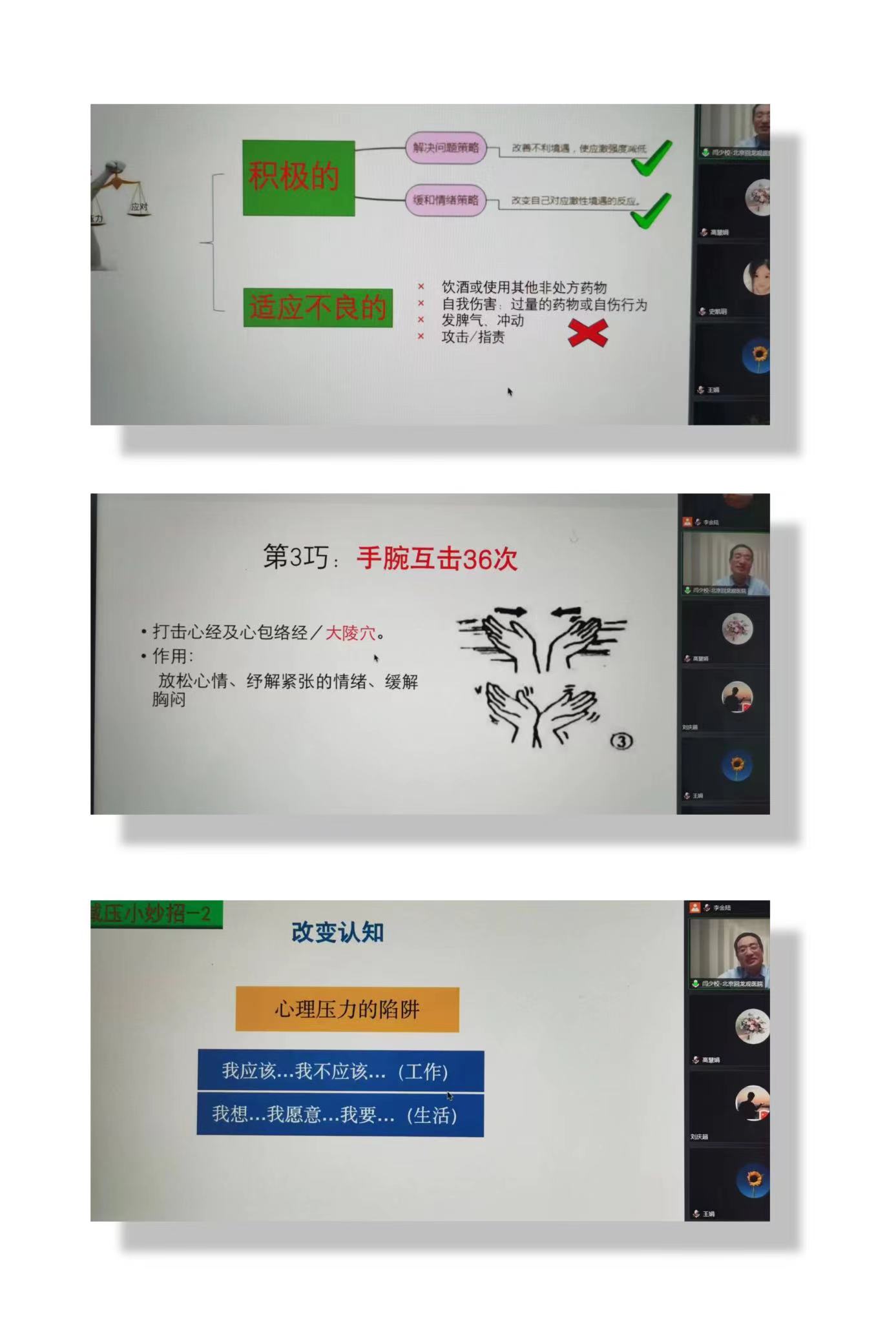 闫教授从当前疫情下医务工作者心理压力的来源、应对策略、减压小技巧等方面进行了详细讲解,课程通过图片、影像、案例等生动展示更助于大家理解掌握,同时组织职工进行了在线练习。