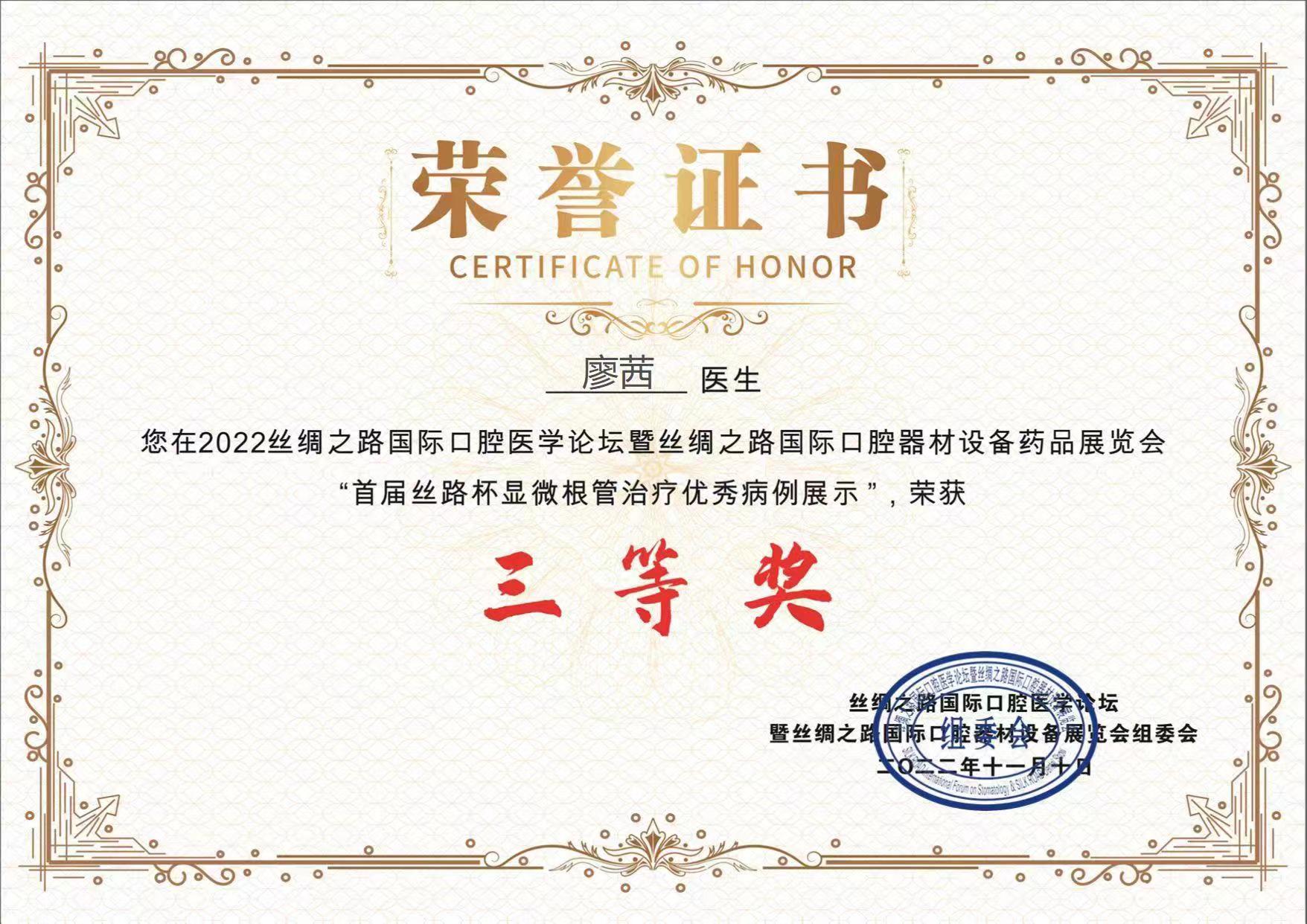 近日,我院第二批青年科技创新人才李韶容、牙体牙髓科青年医师廖茜在首届“丝路杯”显微根管治疗优秀病例展示中分获一等奖、三等奖,为医院及科室争得了荣誉。