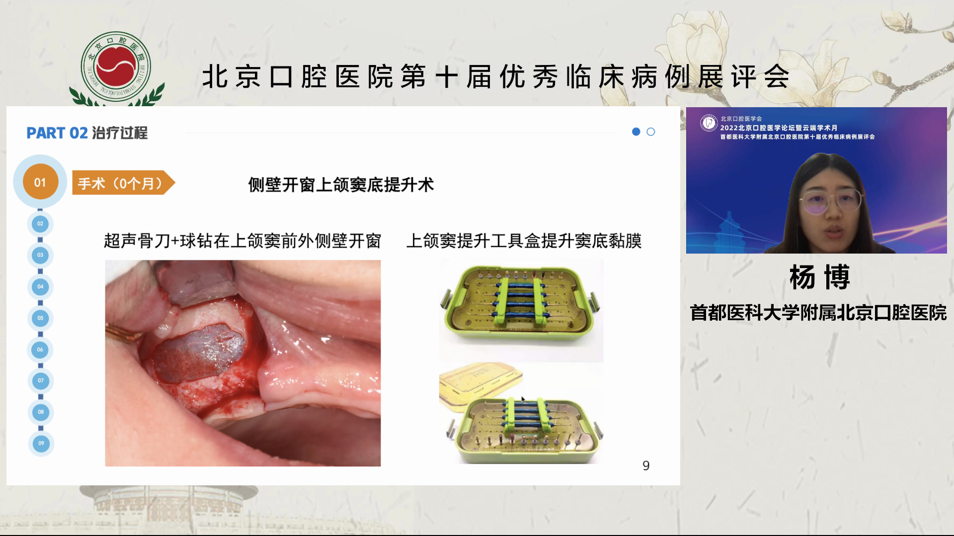 本年度各专业组共评选出优秀病例27例,推荐6例入围优秀病例展评,1例参与特别病例展示。优秀展评病例分别为口腔正畸专业组《一例成人骨性II类凸面型患者的代偿性舌侧矫治》、口腔种植专业组《双侧上颌窦底严重骨量不足的上颌牙列缺失种植修复一例》、口腔内科专业组《LCT治疗正畸中牙龈退缩一例》《临渊履冰,步步为营——上颌第一磨牙慢性根尖周炎伴上颌窦穿孔显微根尖手术》、口腔颌面外科专业组《上下颌骨整体后退治疗双颌前突病例报告1例》、口腔修复专业组《动态咬合记录辅助下的上前牙扇形展开修复治疗》。特别展示病例为口腔内科专业组《超声法微创取出弯曲根管根尖区分离器械》。