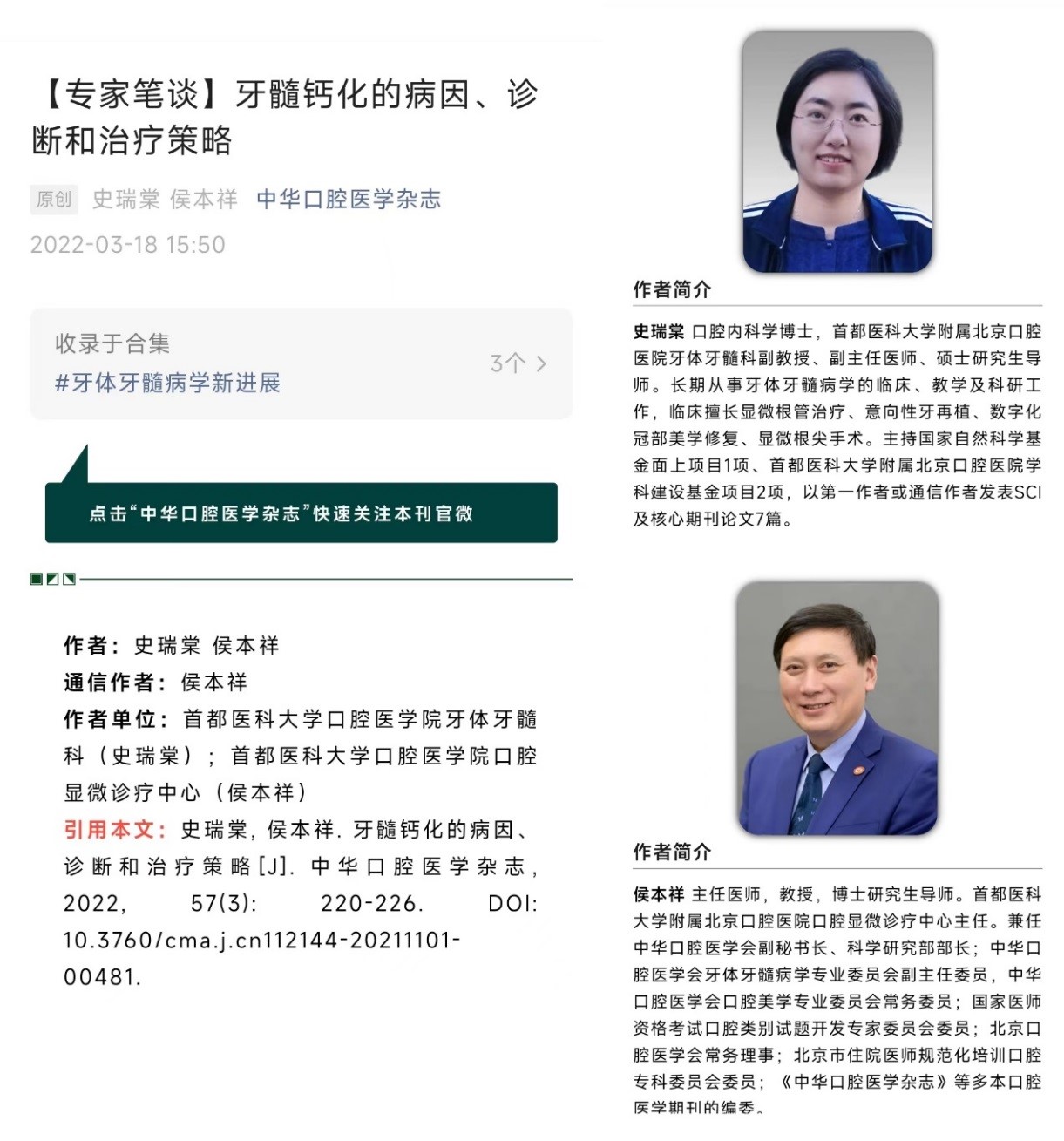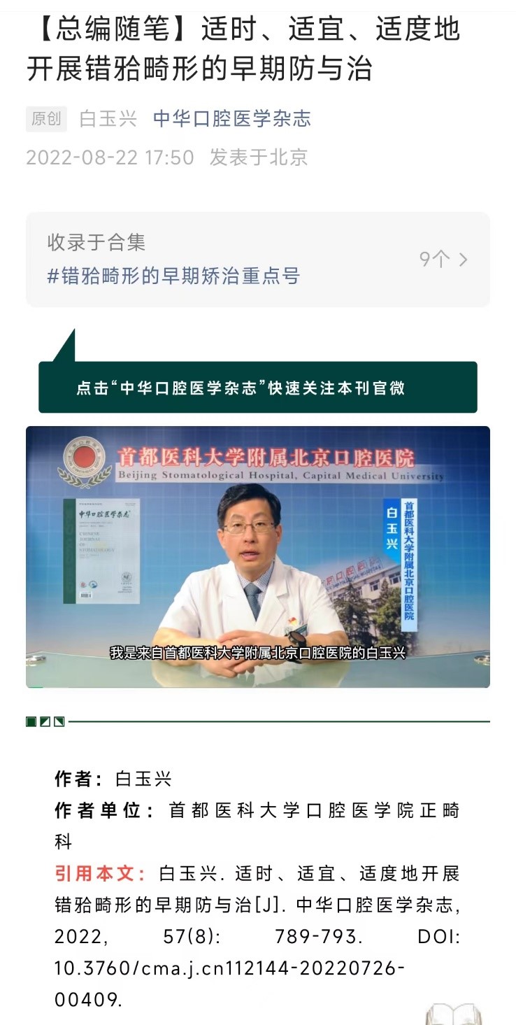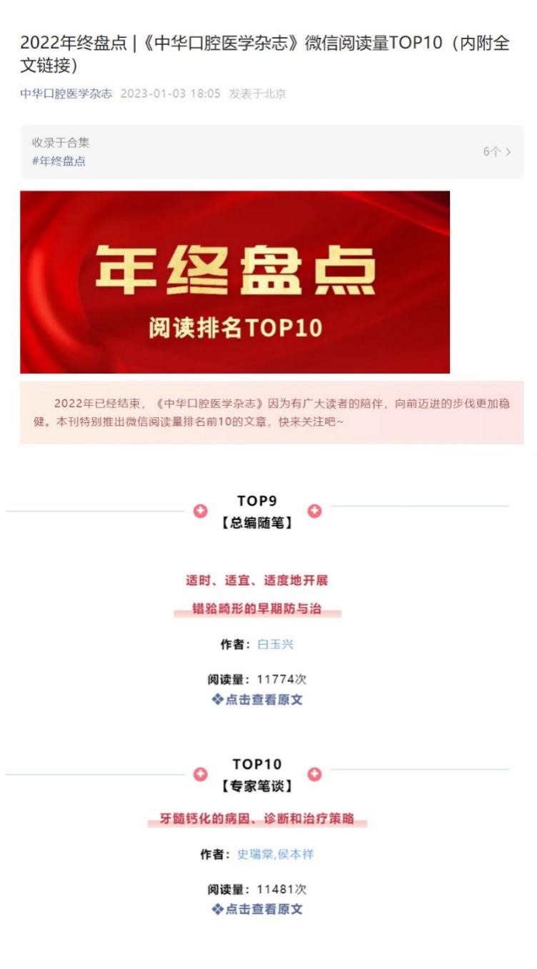 《中华口腔医学杂志》在国内口腔医学界具有重大学术影响力和权威性,位居口腔医学类期刊首位,2022年其官方微信公众号的阅读量超过20万次。白玉兴教授的《适时、适宜、适度的开展错𬌗畸形的早期防与治》,从如何开展正畸治疗、开展早期矫治的基础和保障、如何正确理解和认识错𬌗畸形早期矫治、开展早期矫治应关注的问题、积极倡导错𬌗畸形早期矫治的多学科合作与协作,以及以科学和严谨的态度看待“颜面管理”六方面,探讨如何适时、适宜、适度地开展错𬌗畸形的早期防与治,阅读量达到11744次。侯本祥教授和史瑞棠副教授发表的《牙髓钙化的病因、诊断和治疗策略》对牙髓钙化的病因、发病机制、诊断和治疗策略进行系统阐述,为口腔医师正确诊断和治疗牙髓钙化提供参考,阅读量达到11481次。