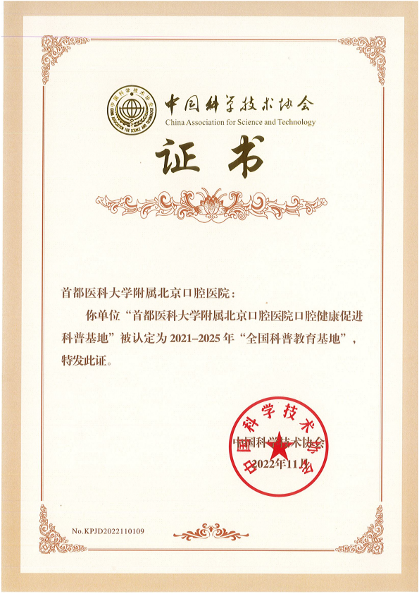 为贯彻落实《全民科学素质行动规划纲要(2021-2035年)》,加强科普基础设施建设,推进全国科普教育基地发展,根据《全国科普教育基地创建与认定管理办法》,中国科协于2021 年10月和2022年4月分别开启 2021-2025 年度全国科普教育基地认定和补充认定工作。我院因科普工作成绩突出,具有示范带动作用,被中华口腔医学会推荐参与评选。