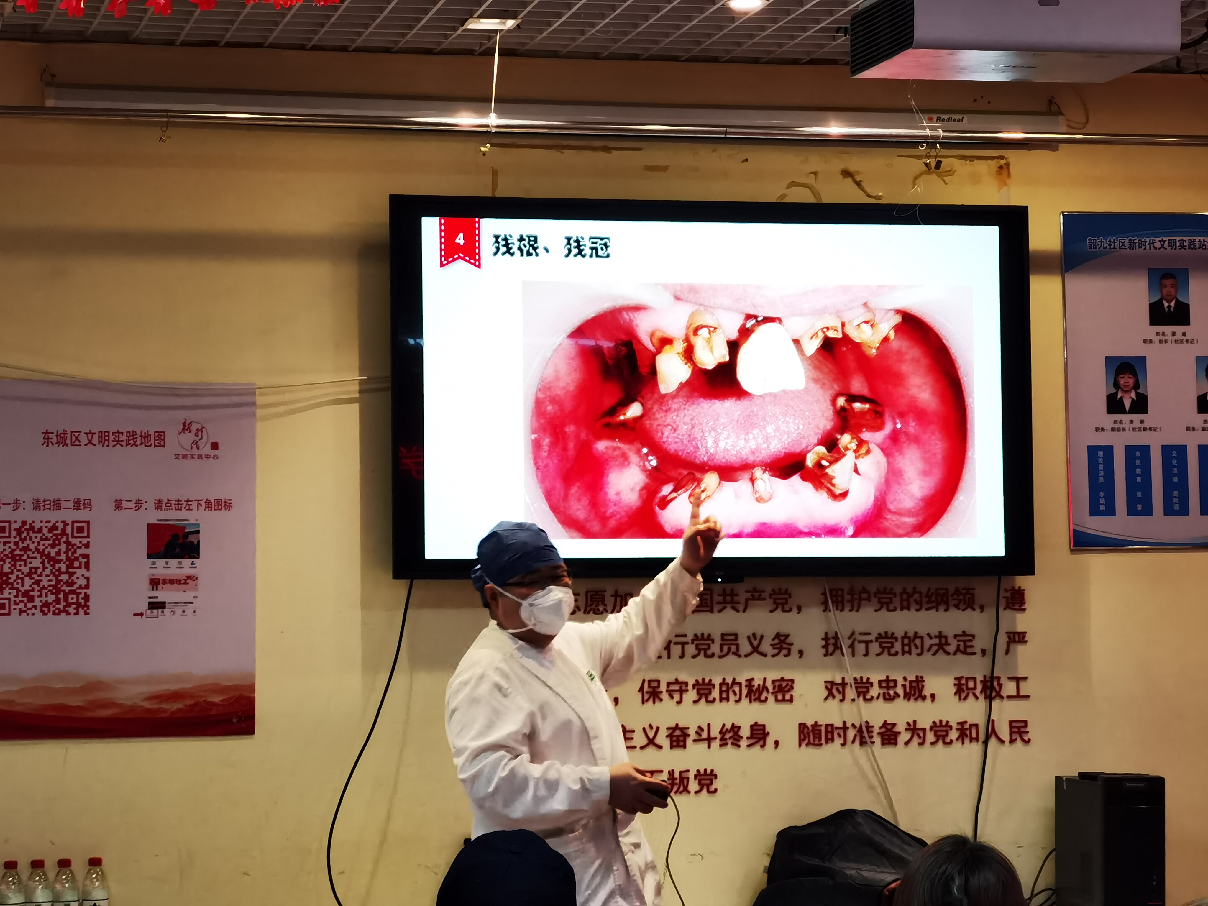 活动现场老年人居多,医务人员们有针对性地为老人们讲解了相关口腔保健常识:王府井部口腔综合科杜岩医生就拔牙相关知识为现场听课的老人们做了详细讲解,言语诙谐,用词专业,使得活动参与者获益颇丰;口腔修复科姚瑶医生对老人们极为感兴趣的镶牙知识做了耐心讲解,就连社区工作人员也听得聚精会神,连连点头;口腔修复工艺制作中心陶涛技师则针对镶牙后的义齿维护问题进行答疑解惑,生动细致的讲述消除了老人们对镶牙后的种种疑虑。