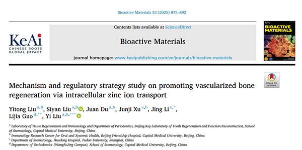 近日,由首都医科大学附属北京口腔医院郭力嘉/刘怡团队在《Bioactive Materials》(中科院一区TOP刊,IF=20.3)发表题为“Mechanism and regulatory strategy study on promoting vascularized bone regeneration via intracellular zinc ion transport”的研究论文,首次揭示了间充质干细胞(MSCs)在骨缺损修复中通过锌离子(Zn??)转运调控血管生成与成骨偶联的关键机制,并创新性开发出“靶向递送+光热调控”的双级治疗策略,为临床大面积骨缺损修复提供了解决方案。