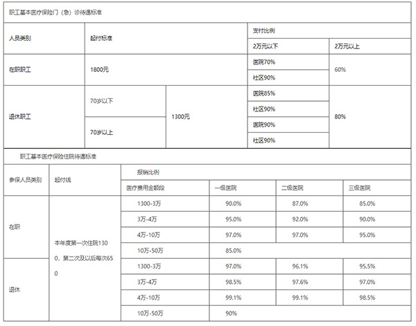 2001年本市建立了门诊统筹和住院统筹相结合的城镇职工基本医疗保险制度。目前,本市在职职工医院门诊报销比例达到70%,退休人员达到85%以上,社区卫生机构报销比例均为90%,门诊报销2万元以上,再发生医疗费用,在职职工报销60%、退休人员报销80%。本市在职职工住院报销比例在85%以上,退休人员住院报销比例在90%以上,最高可达99.1%,住院封顶线为50万元。