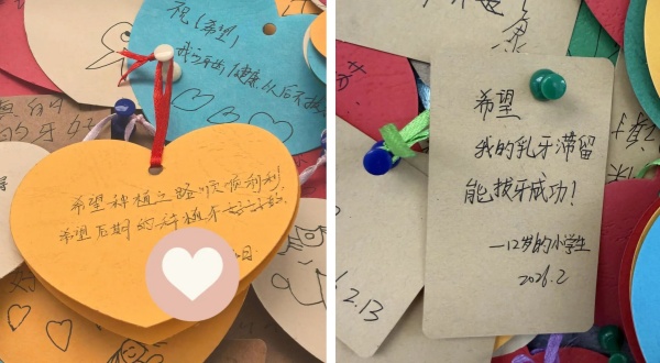 家长的温柔寄语,藏着细碎的疼爱:“我的宝贝,希望你的牙儿可以越长越齐,越长越白”“希望我宝贝手术顺利,平安出院,好好吃饭,健康成长”。