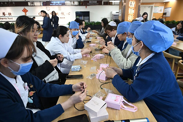 3月6日下午,手工制作活动中,党委书记丁枭伟代表院党委向辛勤工作在各个岗位的女同胞们致以节日的祝贺和崇高的敬意。他说,全体女职工以巾帼不让须眉的担当精神,守护生命、服务患者,是医院高质量发展不可或缺的中坚力量,在工作中发挥了不可替代的作用,希望大家继续坚守初心、爱岗敬业、绽放风采;医院将一如既往关心关爱女职工,希望大家在繁忙的工作之余放松身心,度过一个温馨、快乐的节日。