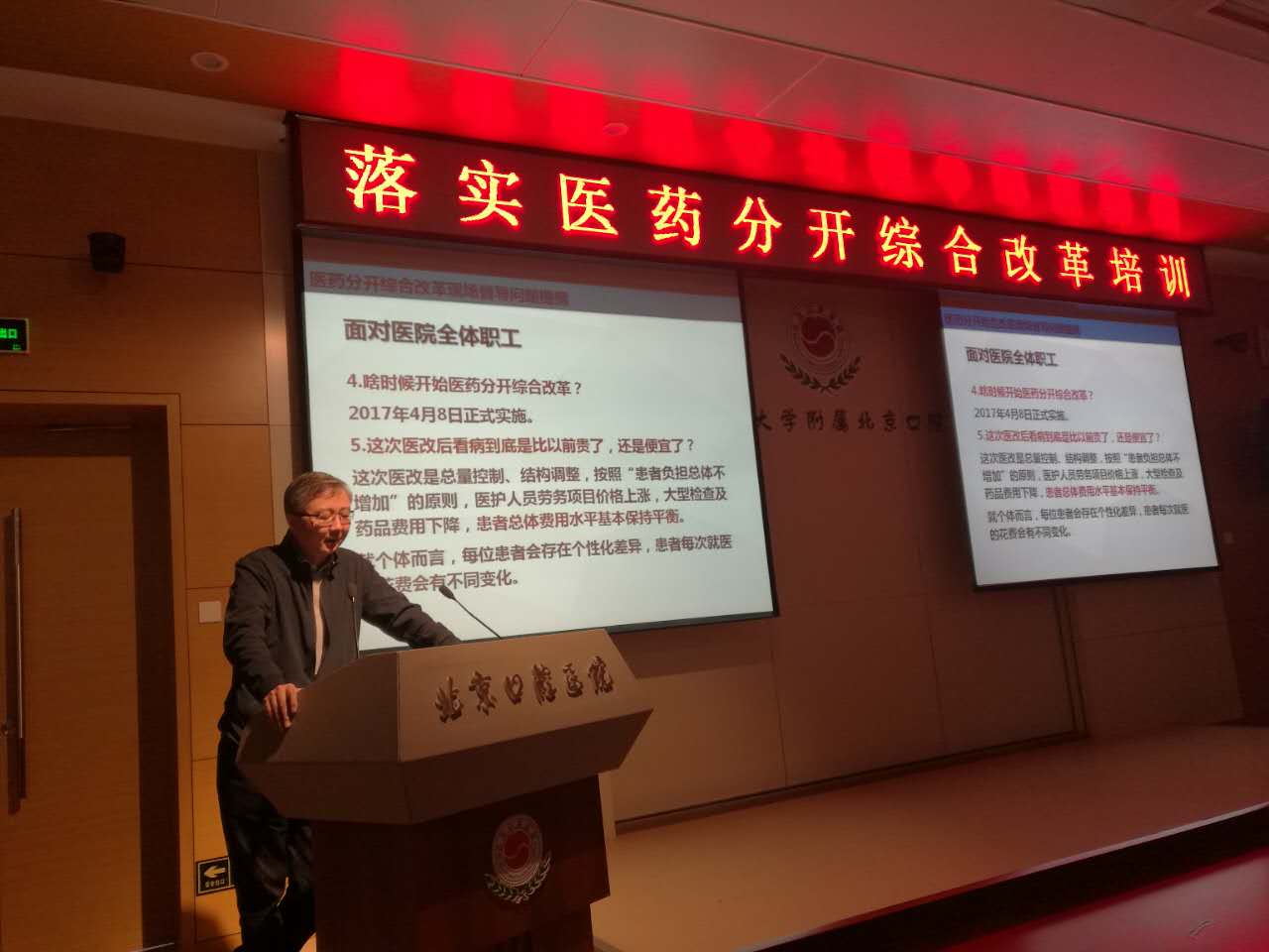 为了全面落实北京市医药分开综合改革各项政策及举措,明确改革过程中各项实际操作规范及注意事项,确保各项工作运行顺畅,按照我院医药分开综合改革领导小组的要求,3月30日下午3:30,门诊部、信息中心及财务处组织了门诊医务人员医药分开综合改革培训会,门急诊科室主任、副主任、值班主任、护士长、外科党支部及综合党支部成员参加了会议。