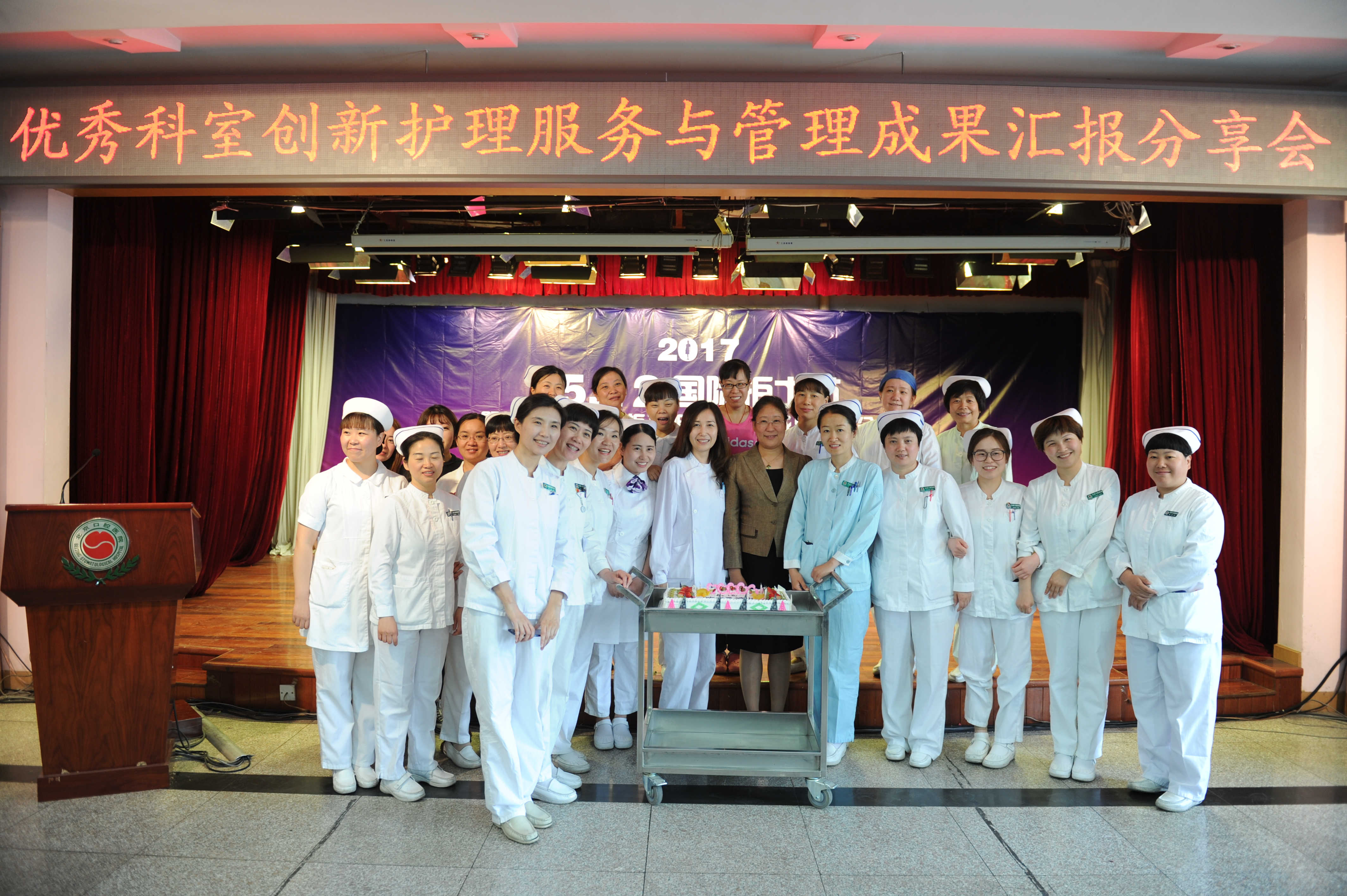 我院2017年护士节庆祝大会于5月12日下午在多功能厅举行。副院长刘淑敏、院长助理宋鹰、院长助理王建华出席会议,医务处处长苏静、工会副主席马艳艳等行政、临床科室主任、支部书记、全体护士长和部分护士代表一同参会。
