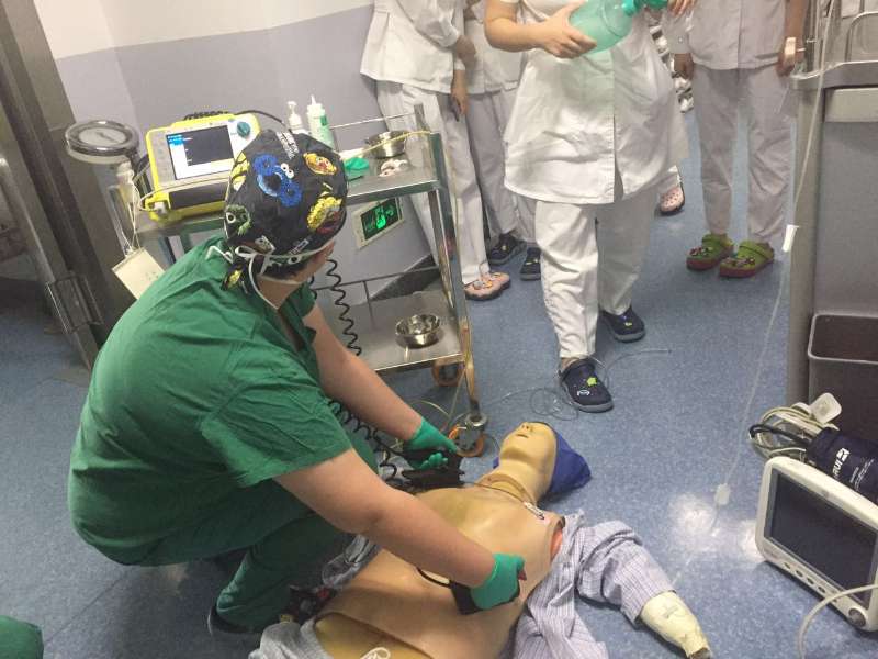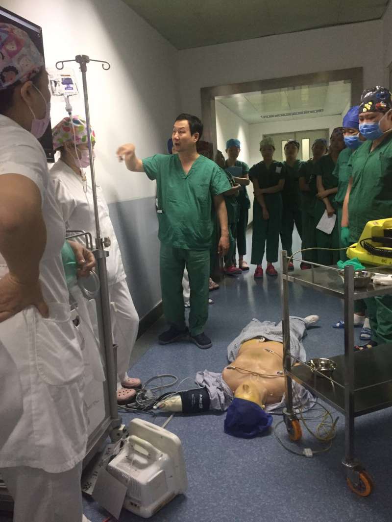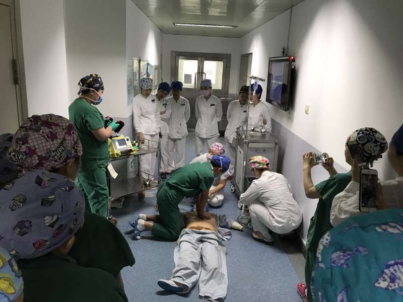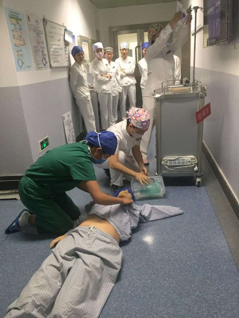 为了进一步提高护理人员掌握急救技能的熟练度和应急反应能力,2017年5月26日上午,麻醉科在主任石立新及护士长毕慧妍的组织下进行了一次应急演练。现场模拟一位患者在转运途中突发意识丧失,当班护士立即启动应急系统,在呼叫医生的同时组织其他护士实施救助。
