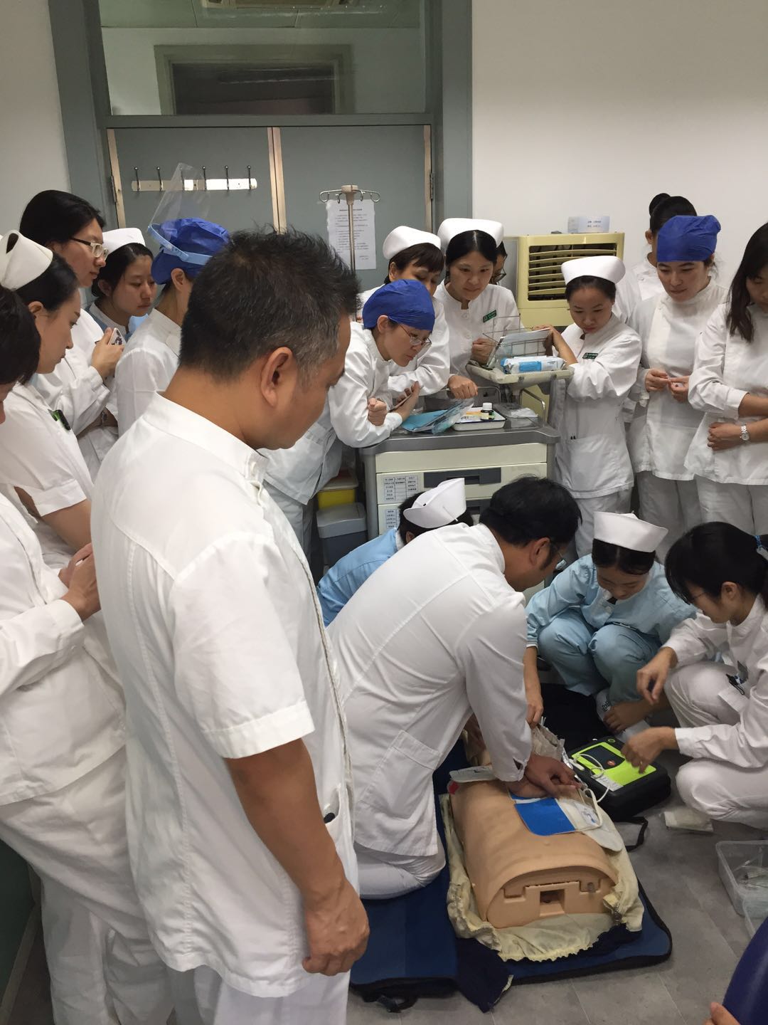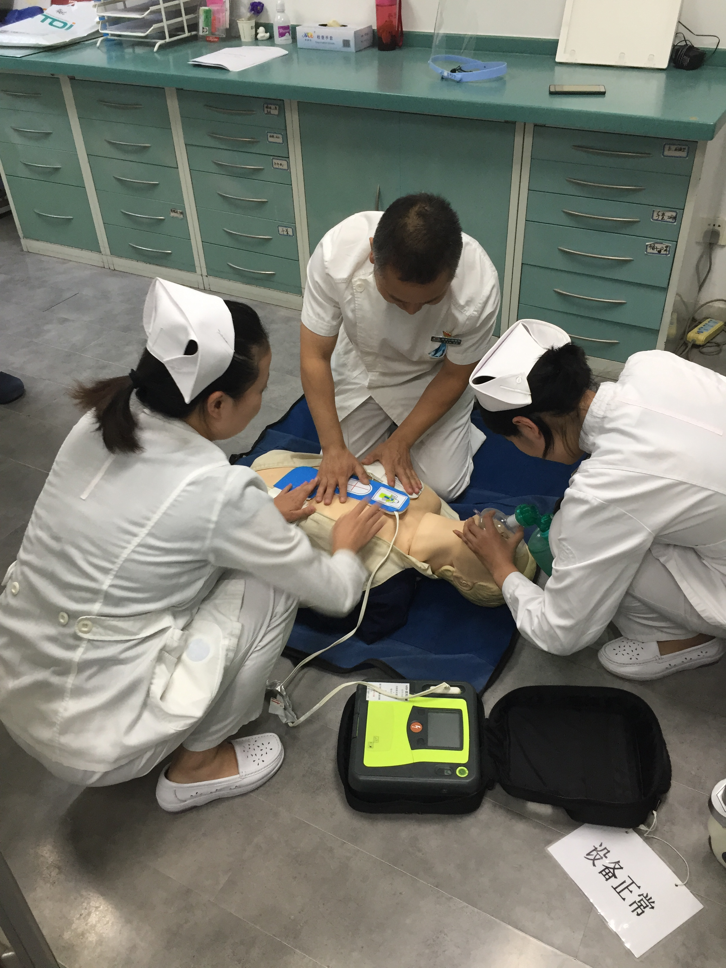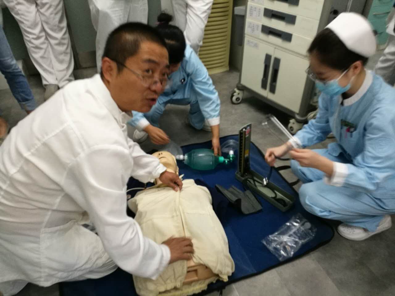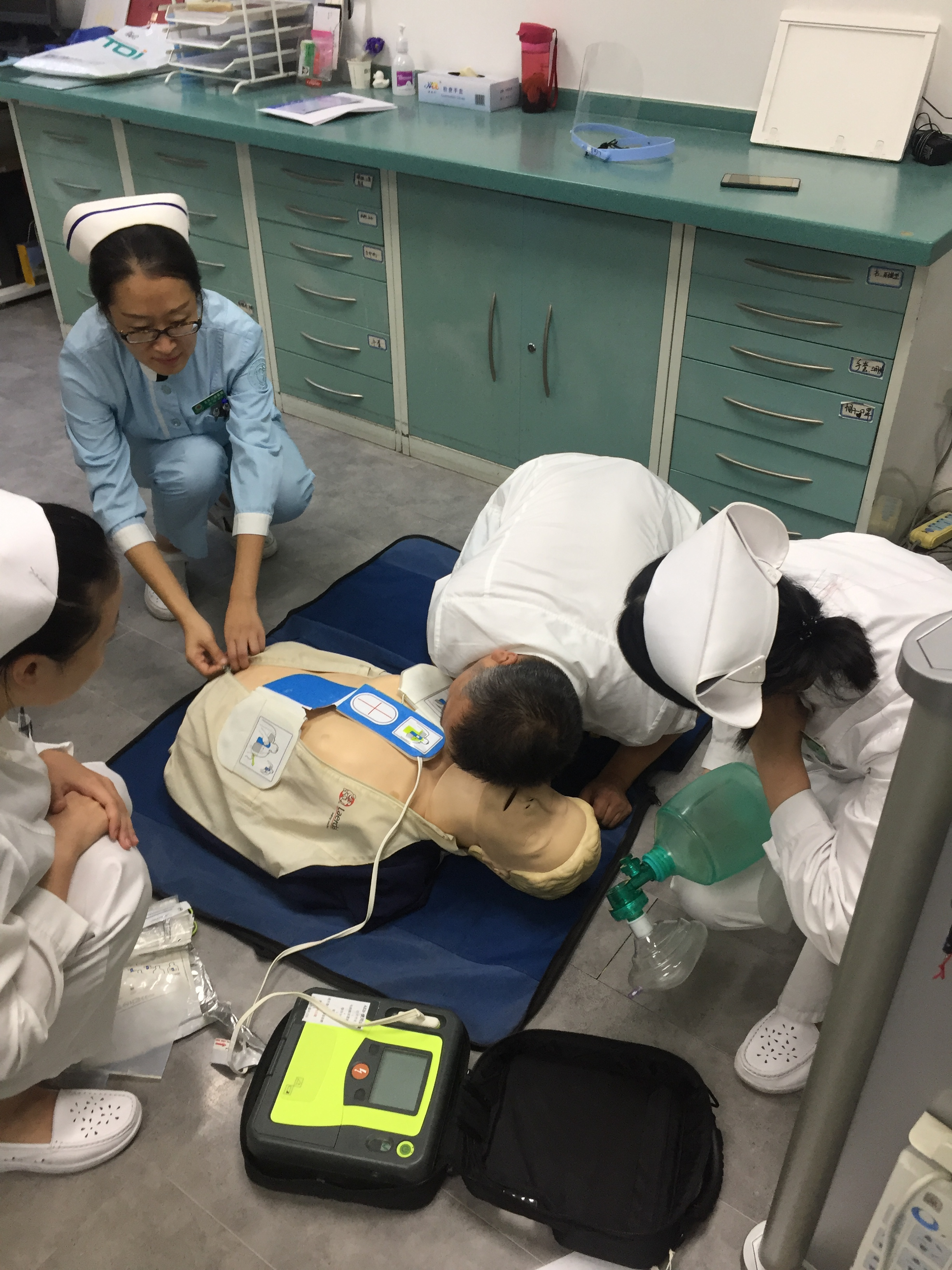 培训中,大家积极参与,四人一组,明确各职责分工,有条不紊地进行“救治”,并保证每人均能快速正确找到胸外按压位置且有效进行CPR操作,并进行电除颤仪的使用。培训同时演练了除颤仪故障应急预案,能做到及时通知麻醉科和病房人员前来救助。