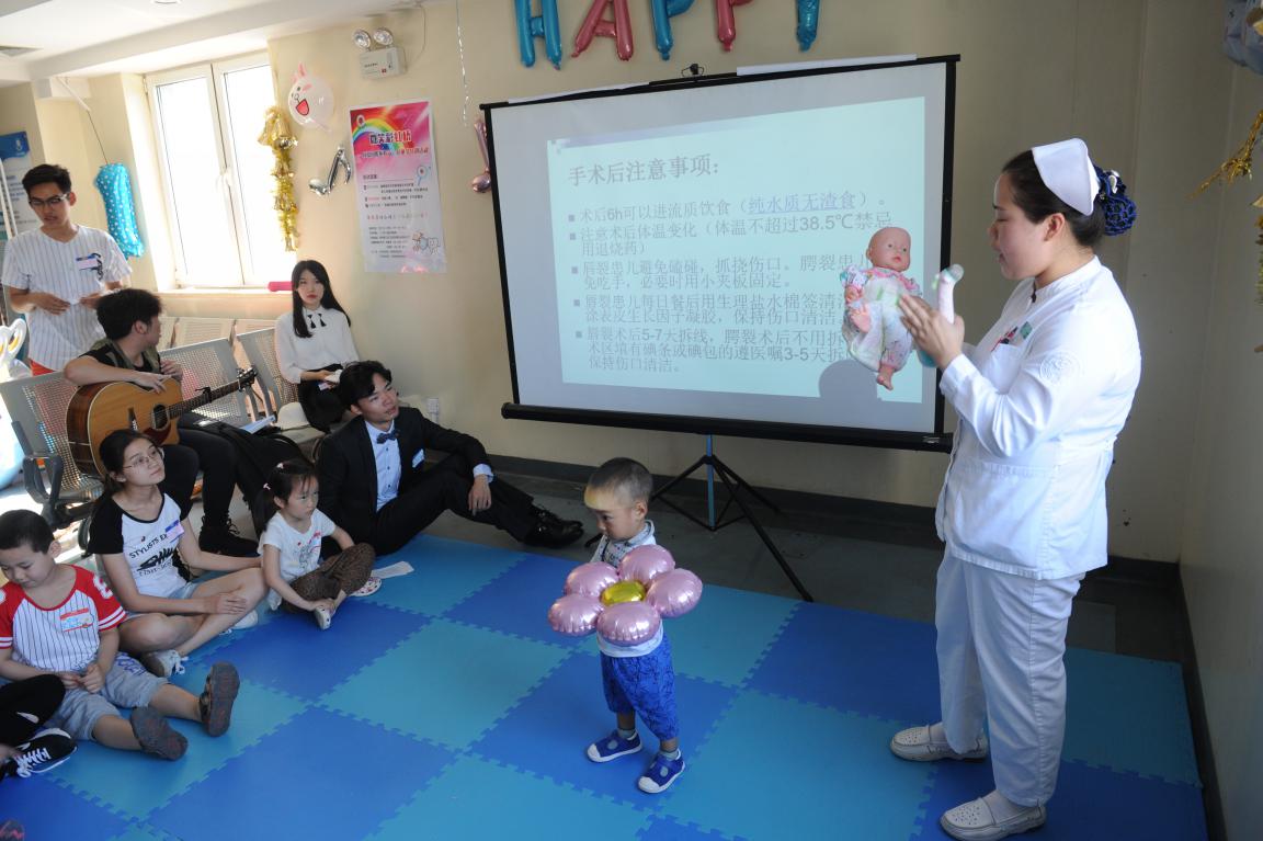 在轻松的氛围中,青年志愿者们为患儿家属进行了“牙牙小课堂”科普宣教,主要讲解了唇腭裂手术术前准备及术后护理等内容,口腔颌面整形创伤外科陈仁吉主任也就诊疗过程中的常见问题与家长们进行了良好互动。
