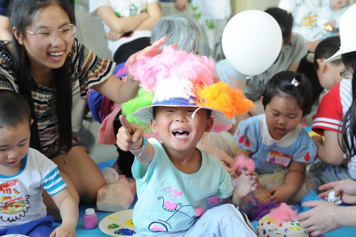 简单的科普宣教后是“七彩手工课”环节,青年志愿者首先向小患者们介绍了彩虹帽的制作方法,鼓励大家发挥自己的创造力和想象力,在帽子上画出自己心目中的彩虹图案,并用棉花作为云朵进行装饰组合;孩子们在志愿者哥哥姐姐们的帮助下,成功完成了一顶顶色彩缤纷、有着美好寓意的帽子,大家戴上自己做成的彩虹帽,纷纷合影留念,现场成为了一片欢乐的海洋。